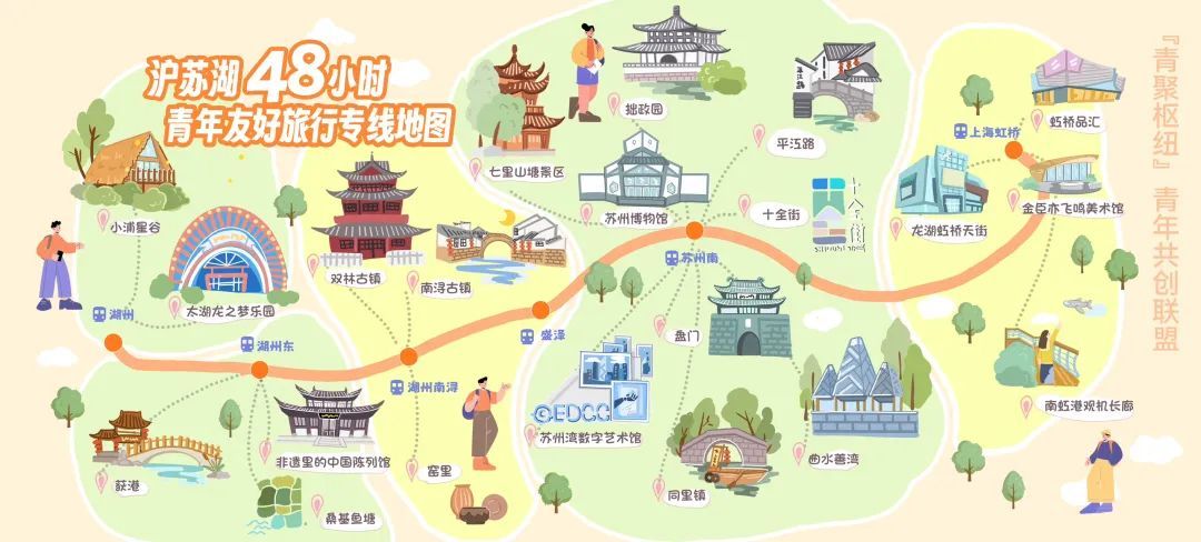 当记者在虹桥火车站到达层初次见到抵达的队伍时,不少青年间已经有说有笑,据新虹街道团工委相关负责人介绍,在乘车过程中即设置了提前破冰环节,帮助青年提前增加相识相熟机遇。 此次活动中,五地团委携手成立“青聚枢纽”青年共创联盟,并联合发布“沪苏湖48小时青年友好旅行专线”地图。据悉,该旅游专线将串联起新虹街道、吴江曲水善湾、长兴小浦星谷、姑苏平江路、南浔古镇等多个值得打卡的热门点位及文化地标,帮助青年们轻松实现沪苏湖48小时短途之旅,进一步推动区域文旅融合与青年交流,深化五地在青年发展领域的合作。 激活青春经济多元潜能 本次活动以“青春·无界·共创”为主题,意在表达青春澎湃、合作无界、共创未来的理念,新虹街道是承载着虹桥国际开放枢纽建设和长三角一体化发展双重国家战略的核心承载区,依托虹桥综合交通枢纽的区位优势,本次市集是推进“枢纽型”青春经济、打造长三角1小时青年友好生活圈的一次创新探索,让“单城恋”升级为“多城缘”,为长三角一体化发展注入青春活力。 作为2025虹桥国际咖啡文化节的主活动之一,记者在市集上看到,除了知名咖啡小铺“宛平南路600号精神咖啡”、新虹青年发展型社区的7coffee、市级非遗项目“杏家香囊”、官宣单身博物馆等特色小店,以及“2024年度我最喜爱的十大夜校课程——AI职场加速器”“翼心理”心理咨询等青年夜校摊位,旨在通过青年友好市集等方式,强化对青年创新创业的支持与服务,为店铺主理人们提供品牌宣传和产品推介的机会,提升知名度和影响力,将青春流量转化为经济增量,为优化营商环境贡献青春力量。 记者看到,活动现场还有“特别的客人”:来自苏州吴江和姑苏当前正在打造的“雪茧艺文创”和“有光集文创”2家青春小店。“有光集文创”小店负责人告诉记者:“青春经济的魅力就在于有无限可能,这次市集对我们的国潮文创走出江苏来到上海,是难得的机会。‘跨’不是目的、‘融’才是想要的,市集还没开始前我就和上海的青春小店聊了聊,发现大家都有很多共同语言,不同的创意,却有着一样的梦想”。 以文旅融合新范式 打造长三角“青春会客厅” 近年来,新虹街道围绕青年发展型街镇建设,全力打造24小时“年轻力”单元,已陆续打造爱博四村青年友好型社区、虹桥品汇青年发展型园区和绍虹路商圈青年活力型街区,为青年提供创新、就业、安居、婚恋等方面友好场景,实现“以年轻力激活城市发展,以城市温度反哺青年成长”双向奔赴。 未来,新虹将继续深化“青聚枢纽”青年共创联盟纽带作用,探索与长三角多地团委在青年创新创业、研学交流、志愿服务等方面的合作,以开放姿态为青年汇聚资源、以创新活力助青年成长成才,努力成为长三角一体化协同发展中的重要支点,让长三角成为青年建功立业的沃土。