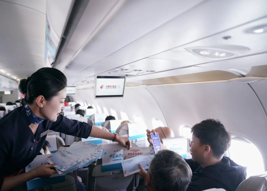 在值机环节,旅客获得了纪念版登机牌,在登机口,收获主题航班的定制文创,步入客舱,行李架和座椅头巾均被“中国旅游日”主题的山水画装饰,氛围感满满。