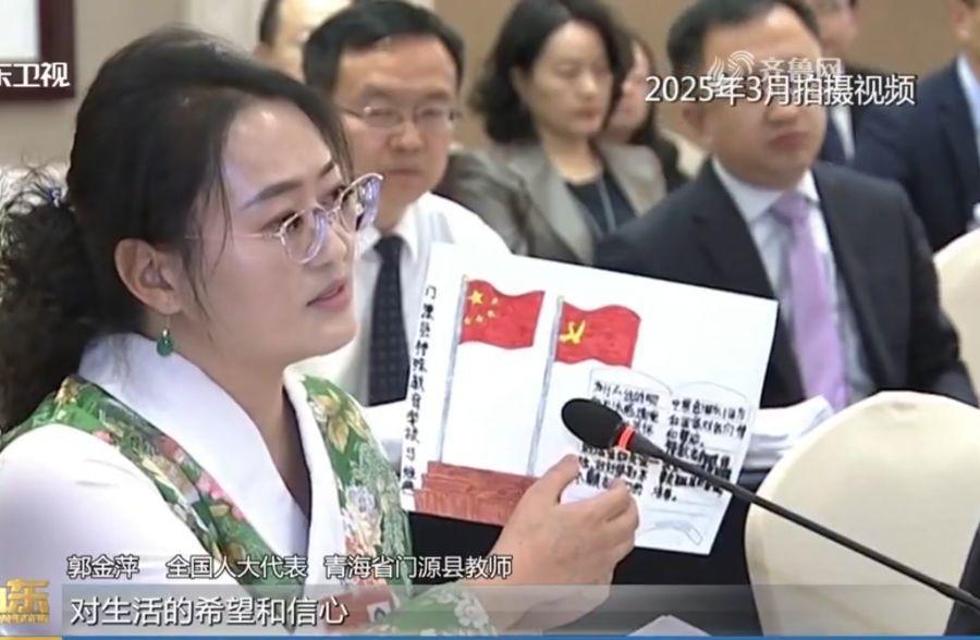 全国人大代表、青海省门源县教师郭金萍在全国两会上讲述马维燕的故事(资料片)。