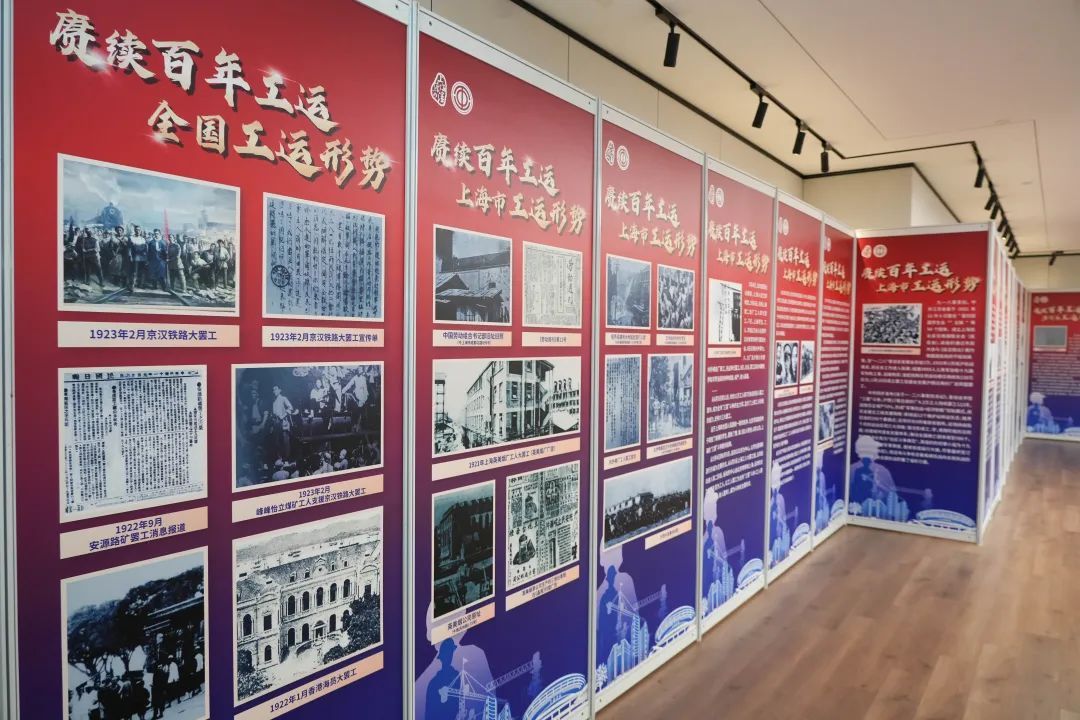 此次巡展以百年工运历史为主线,通过珍贵照片、影像资料、劳模荣誉等展品,生动展现中国工人阶级与民族命运同频共振的奋斗足迹。入口处的艺术门头以“100”和“25”为核心造型,分别寓意全国总工会与上海总工会的百年峥嵘岁月,以及漕河泾街道撤镇建街道25年的发展历程。门头上镌刻的五卅运动、抗战胜利、新中国成立、改革开放及漕河泾街道成立等年份数字,串联起工运精神与时代变革的紧密联结,彰显工人阶级在历史洪流中的磅礴力量。