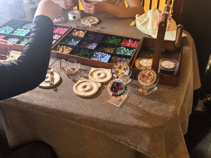 记者在南京金茂览秀城的牛New寿喜烧店看到,在等位期间,店内为顾客提供了非遗串珠的体验活动。店员告诉记者,24个小盒子内摆放了各种颜色的珠子,顾客可以根据自己的喜好挑选不同的珠子,将其串成手链。2—5人同桌用餐免费体验一串,6人及以上可以体验两串。