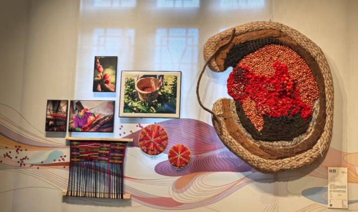 比如“收获”篇章,运用织锦工艺,描绘了从一棵咖啡树到产出咖啡浆果这长久的积累后,迎来成熟收获的阶段。介绍牌上写道:“织锦的纹样与珠串色彩的碰撞,蕴含着成熟意象的直接表达,体现着咖啡浆果的生命旅程步入成熟阶段的充盈。”