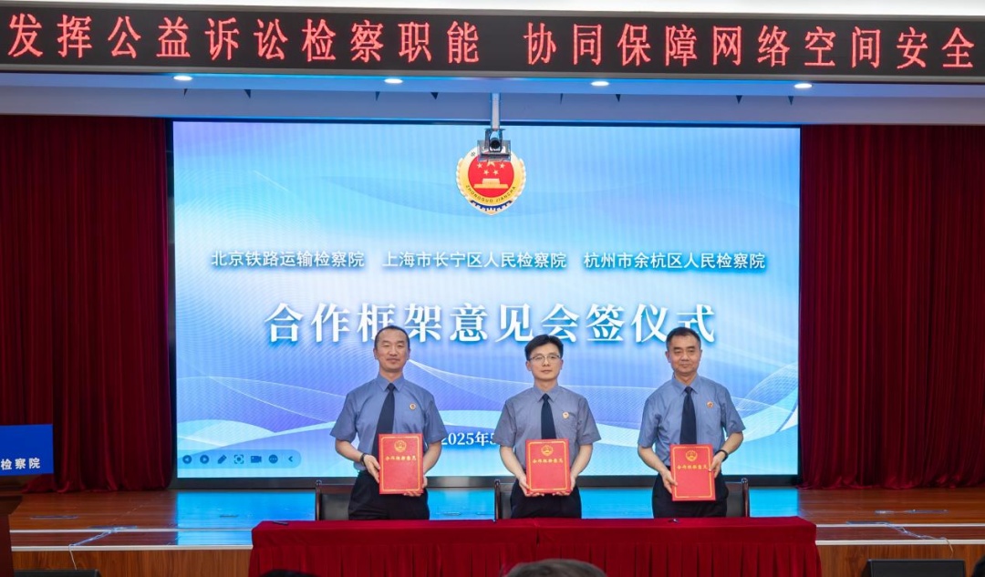 为推动形成互联网公益诉讼跨区域协作检察合力,5月13日,北京铁路运输检察院、上海市长宁区检察院、浙江省杭州市余杭区检察院在北京举行“发挥公益诉讼检察职能 协同保障网络空间安全”合作仪式,并签署《关于发挥公益诉讼检察职能协同开展网络空间治理的合作框架意见》(下称《意见》)。