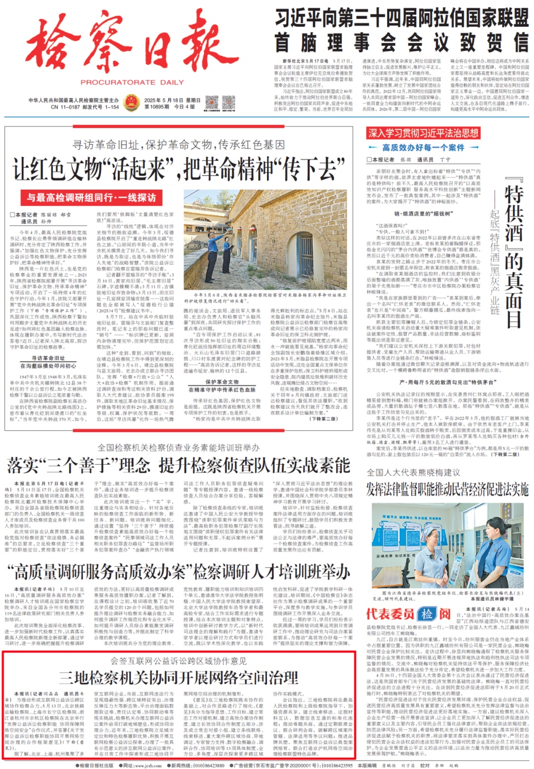 会议指出,三地检察院将在最高人民检察院和上级检察院指导下,加强资源共享,建立线索移送、证据材料互认、数据信息互通的标准化流程;推动难题共商,通过定期联席会议、联合研判会商,破解跨区域案件管辖、法律适用等争议问题;推进品牌共塑,聚焦互联网公益诉讼典型案例培育,联合打造京沪杭网络空间治理检察联盟特色品牌。