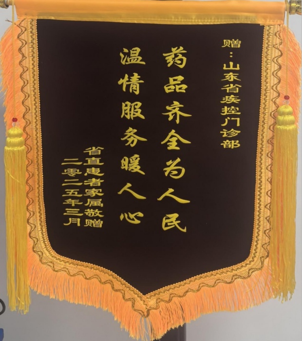 “药品齐全为人民,温情服务暖人心”,日前,一面承载感激的锦旗送到了山东省疾控中心健康服务中心医护人员手中。