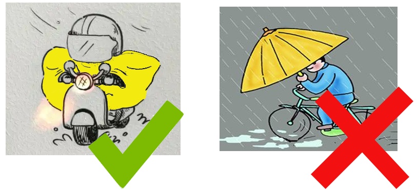 不要在骑行电动自行车或自行车时使用雨伞,单手骑车易失衡,正确的做法是穿上颜色鲜艳醒目的雨衣,使得其他车辆和行人更容易注意到。同时,骑乘电动自行车要规范佩戴安全头盔,避免滑倒摔伤头部。