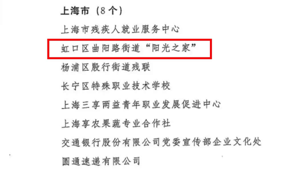 日前,第七次全国自强模范暨助残先进表彰大会在北京举行。表彰会上,虹口区曲阳路街道“阳光之家”获“全国残疾人工作先进集体”荣誉称号。