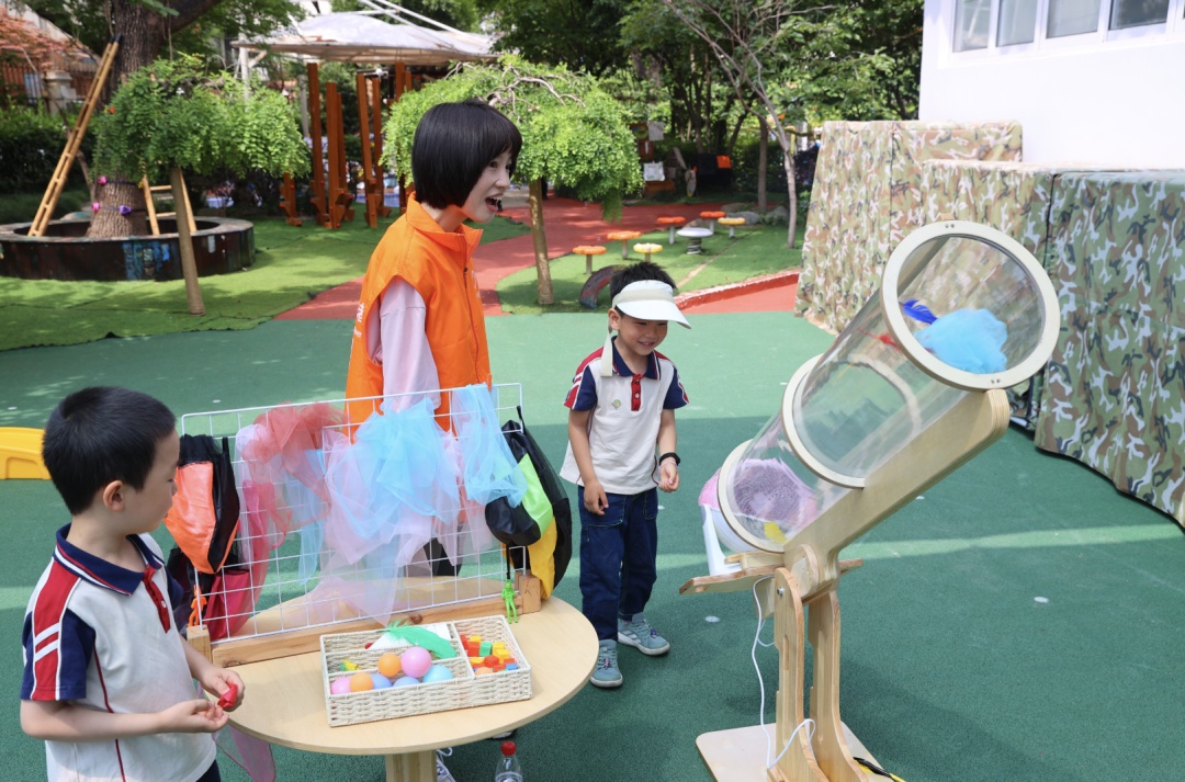 如果说主会场的“科技派对”是梦想的播种机,那么分布在幼儿园各角落的“童趣妙想集市”则成为实践探索的试验田。教师们设计的各个游戏站台,将抽象科学转化为可触可感的实践课堂。