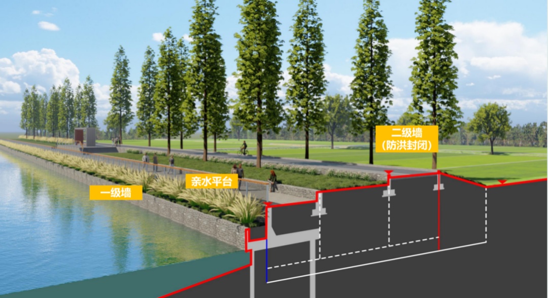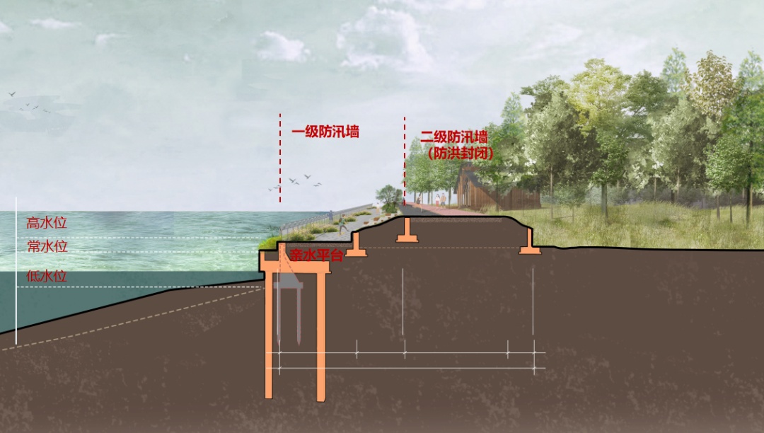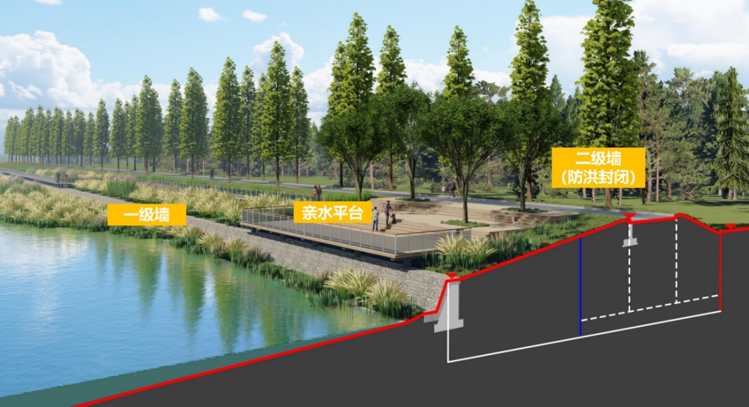 亲水平台通常结合堤防设施布置,为保证平台滨江体验,常布置于堤防防洪线以外,亲水平台外侧(临水侧)一般为堤防一级防汛墙,内侧(陆域侧)为堤防二级防汛墙,通过二级防汛墙实现防洪封闭。也有亲水平台高程位于防洪高程,或采用栈桥、码头等独立于堤防设施并兼做亲水平台的情况。