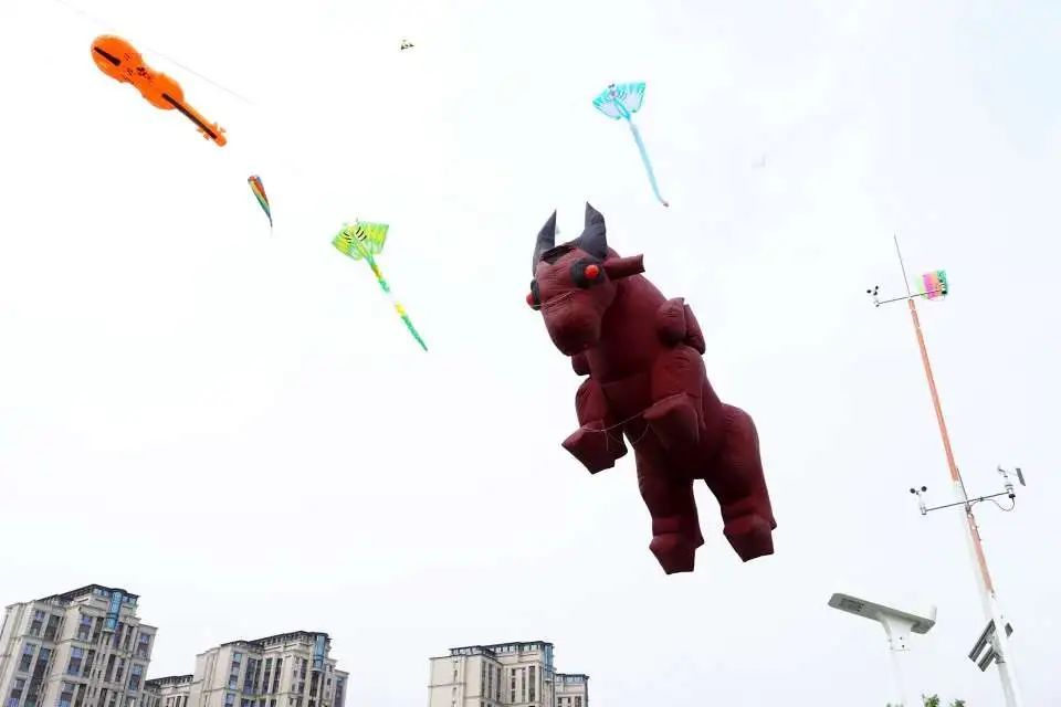 一大早,各地的参赛运动员们便兴致勃勃提前来到赛场进行检录和热身。随着裁判长一声令下,五彩斑斓的风筝竞相飞舞、争奇斗艳,风筝在钴蓝色天幕上织成浮动的绸缎,竹骨撑起的蝶翼正将阳光筛成碎金,龙形长串在气流中舒展鳞甲,斑斓的章鱼触须与流云缠绵。参赛者手中的线轴嗡嗡震颤,丝线绷成无数道银色琴弦,牵引着云端剧场里无声的芭蕾——燕群俯冲时翅尖擦过苍鹰的尾羽,锦鲤摆尾搅碎凤凰拖曳的霞光,每个转折都牵动地面观众此起彼伏的惊呼。