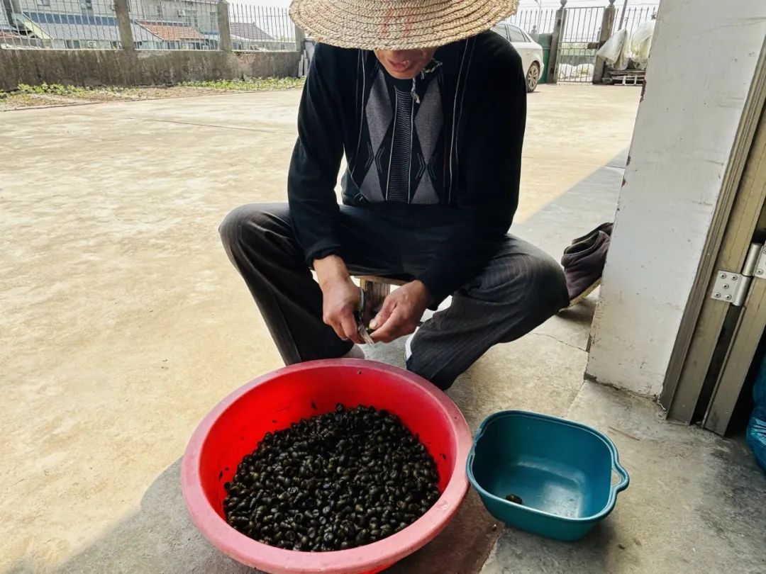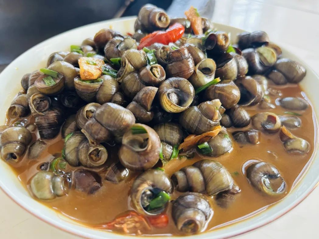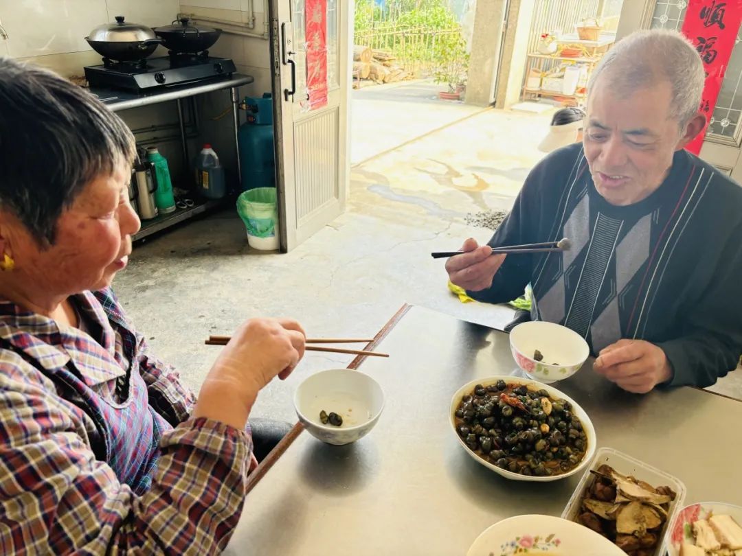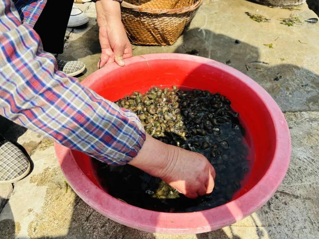 “桃花流水春笋出,最是江鲜味美时。”每年五月,四团镇的狄爷爷和周奶奶都会相约来到河边“趟”螺蛳,开启属于他们的美味之旅。 清晨,村边小河清澈见底,河底的螺蛳密密麻麻地吸附在水草和石头上,偶尔还有小鱼小虾从脚边游过。狄爷爷戴着草帽,扛着螺蛳网来到河边。 他熟练地操作起来,轻轻放下螺蛳网,双手稳稳握住网柄,微微用力抖抖,将网缓缓展开。接着,他弯下腰,小心翼翼地把网沉入水中。狄爷爷将螺蛳网顺着河水轻轻推至河中央的底部,网在淤泥与水草间快速搅动,搅起一片浑浊。 随后,他猛地一提,网中瞬间挤满了密密麻麻的螺蛳。今天还有意外收获,小鱼小虾也被“趟”入网中。狄爷爷看着网里的“战利品”,脸上露出满意的笑容,说道:“这些小鱼小虾放螺蛳里烧,味道会更鲜美嘞!” 狄爷爷满载而归后,周奶奶便开始忙碌起来。她动作麻利地挑出水草和空壳,又把沾满淤泥的螺蛳反复淘洗。不一会儿,螺蛳便褪去泥污,个个青亮光滑。 随后,狄爷爷在院子里坐下,面前放着一盆刚洗净的螺蛳。他抄起钳子,拈起一颗螺蛳,眯起眼睛对准尾部,手腕轻轻一抖,“咔嗒”一声脆响,螺蛳尾端应声而落。老人动作娴熟,手起钳落间毫不拖沓。不一会儿,盆边就摞起了一小堆剪好的螺蛳。 狄爷爷忙着处理螺蛳时,周奶奶已在厨房张罗起调料。她将生姜、大蒜、辣椒细细剁碎,码在碗里备用。灶膛里的火苗蹿起,铁锅很快烧得滚热,待油温正好,周奶奶利落地将处理好的螺蛳倒入锅中,“刺啦”一声,鲜味顿时弥漫开来。 周奶奶一边翻炒一边说:“新趟的螺蛳最好在水里养两天,让里头的小螺蛳都爬出来,这样吃着才干净又鲜嫩。”说着往锅里淋入生抽,添少许清水,转成文火慢慢煨着。十分钟后,揭开锅盖的刹那,她抓起一把葱花撒入锅中。浓郁的鲜香充盈了整个灶间。 热腾腾的螺蛳刚端上桌,老两口便坐在院子里嗦了起来。狄爷爷熟练地夹起一颗螺蛳,凑到嘴边轻轻一嘬,“滋溜”一声,嫩滑的螺肉便滑入口中。他眯起眼睛慢慢咀嚼,皱纹里都漾着满足的笑意。半晌,老人对着周奶奶感叹道:“这滋味啊,跟小时候一模一样。”老两口你一句我一句,往事像这螺蛳汤般越熬越浓。 午后暖阳斜斜地洒在院子里,老两口围坐在小桌前,一边津津有味地嗦着螺蛳,一边絮絮地说着家常。这碗最寻常的螺蛳,让平淡的日子泛起温暖的涟漪,流淌出相守一生的温情。在四团镇,像狄爷爷和周奶奶这样的老两口还有很多,他们用最质朴的方式,守护着传统的美味,传承着浓浓的乡愁,也让我们看到了岁月静好里的幸福模样。