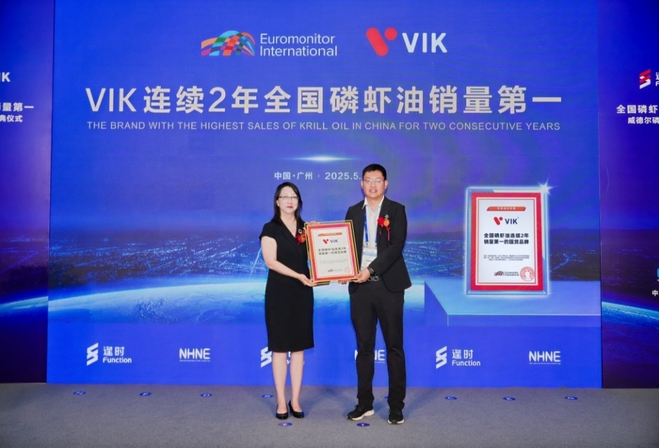 欧睿国际授予逢时VIK“全国磷虾油连续2年销量第一的国货品牌”荣誉