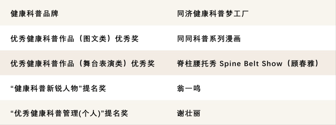 同时,同济大学附属同济医院还在此次大赛中获得了优秀健康科普作品(图文类)优秀奖、优秀健康科普作品(舞台表演类)优秀奖、健康科普新锐人物提名奖以及优秀健康科普管理(个人)提名奖多项荣誉。