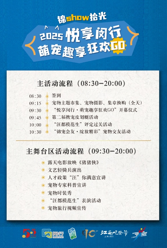 嗨,闵行 嗨!家人们、友友们,休闲时分去哪玩?4月25日起,“今日闵行”版快乐指南来了!闵行文旅商体展新资讯、新场景和新体验一站获取,还有小编独家推荐、互动体验、不定期福利一网打尽,就在“嗨!闵行”! 当萌宠经济邂逅城市消费焕新升级 会碰撞出怎样的火花? 精彩IP赛事火热来袭 这个周六 就在浦江欢乐颂水岸二期·欢乐水岸 一场萌力十足的“活力盛宴”即将上演! 为积极响应上海市第六届“五五购物节”活动要求,闵行区以“悦享闵行·GO!GO!GO!”为主题开展一系列主题鲜明、形式多样、内容丰富的促消费活动。作为闵行区“五五购物节”的重要节点活动,5月24日,浦锦街道联动浦江欢乐颂商圈、行业协会及数十家宠物全产业链企业,举办锦Show·拾光“悦享闵行·萌宠趣享狂欢GO!”活动。 本次活动将以宠物经济为支点,撬动“商旅文体展农”全链条资源,打造“萌宠+”消费矩阵,为广大市民提供更多样、更多元的“萌宠+”消费场景。 从宠物医疗、时尚服饰到健康食品,从携宠皮划艇水上趣味到“汪都模范生”评定过关,从“汪”你满意人才政策宣讲到宠物专家科普宣讲……想你所想,应有尽有! 更有宠物时装秀、露天电影、市集打卡集章兑换限定冰淇淋、宠物友好商户专属折扣、宠物交友赢大奖等好玩的环节等你解锁! 绝对让你和毛孩子嗨到不想回家! 快来一起点燃闵行“五五购物节”的璀璨星火 开启火热“锦”夏 参与指南 ⏰ 时间: 2025年5月24日(周六) 09:15—20:00 ☆ 地点:浦江欢乐颂水岸二期·欢乐水岸 ◄请左右滑动查看► 一键收藏,畅玩攻略 “悦享闵行·萌宠趣享狂欢GO” 开幕仪式重磅来袭! 开场视频 领导致辞 “悦享闵行·萌宠趣享狂欢GO”启动 促销活动发布 浦锦宠物友好“1+1+1”试点发布会 第二届携宠皮划艇活动启动 活动 9:30 开始哦(´-ω-`) 更有超多惊喜环节 快乐根本停不下来 左右滑动查看更多 萌物集结 宠物市集淘惊喜 集章兑换冰淇淋/咖啡 速度与激情 宠物障碍赛超燃开战 时尚顶流 宠物时装秀闪亮登场 人才政策“汪”你满意 爱宠人士速速来看 宠物摄影 让我康康是谁家小宝贝还没拍证件照呀 宠物交友 握个喵爪,交个汪友吧~ 十年浦锦,以萌宠之名,向新而行 五五购物,以消费为笔,绘就幸福 这个周末,带上爱宠 来浦锦邂逅一场“经济活力” 与“城市温度”的双向奔赴! 转载请注明来自今日闵行官方微信