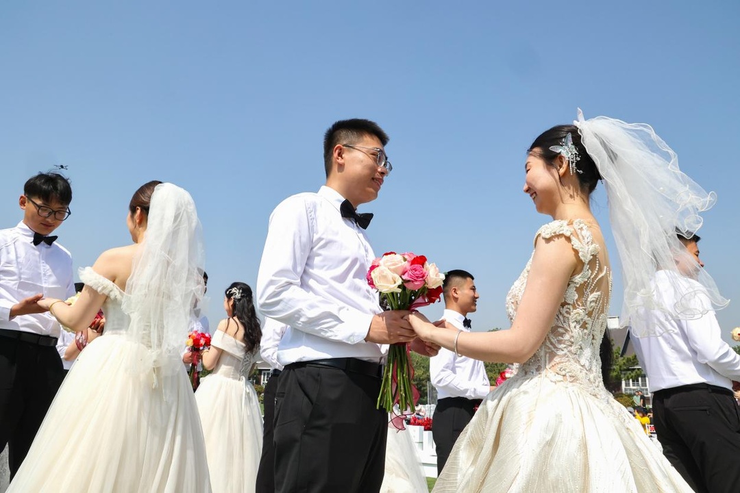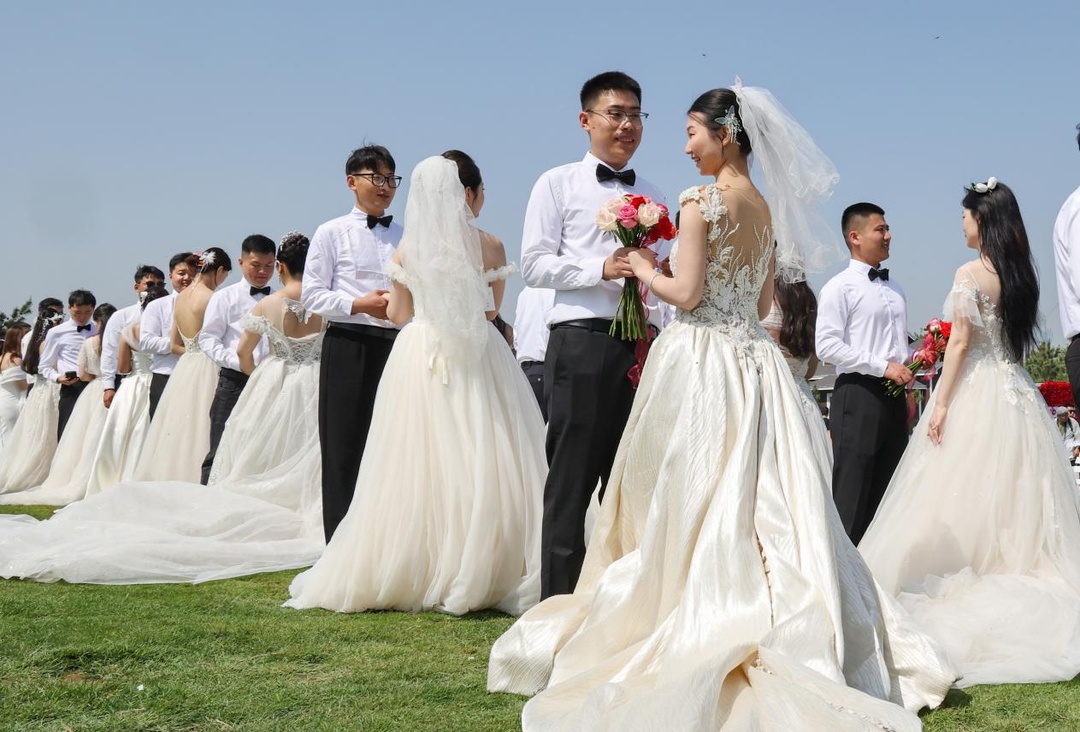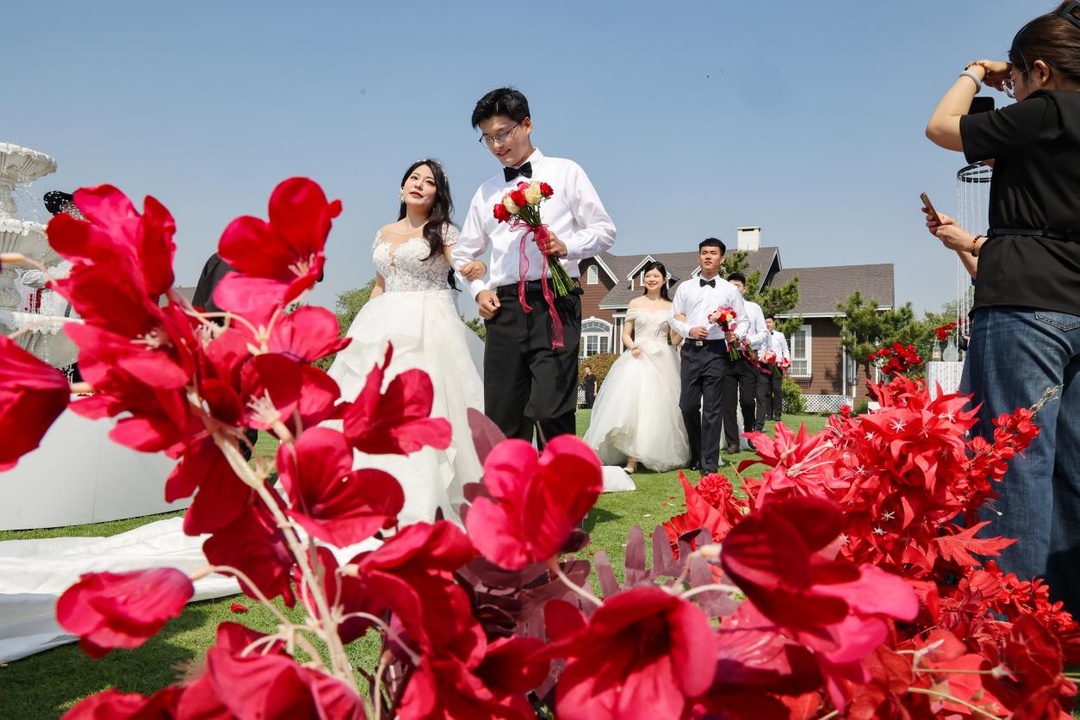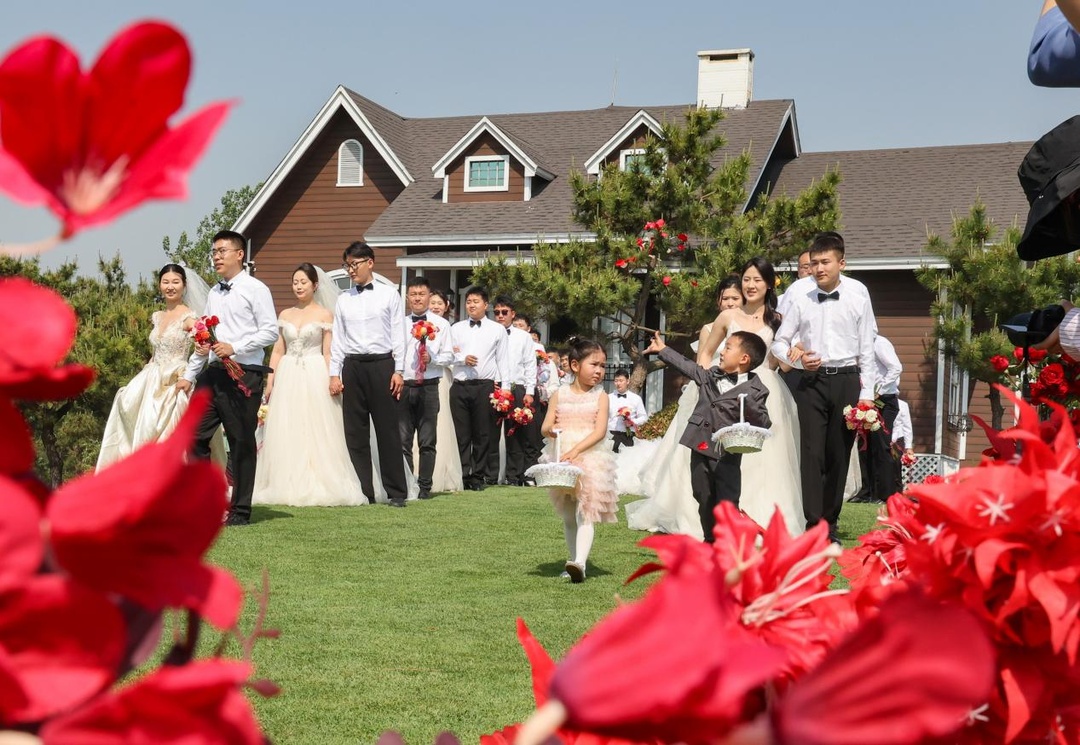 5月20日,在日照市东港区碧海蓝天婚嫁产业园,参加集体婚礼的新人们手挽着手走过草坪,共同迎接人生中浪漫而庄重的时刻。