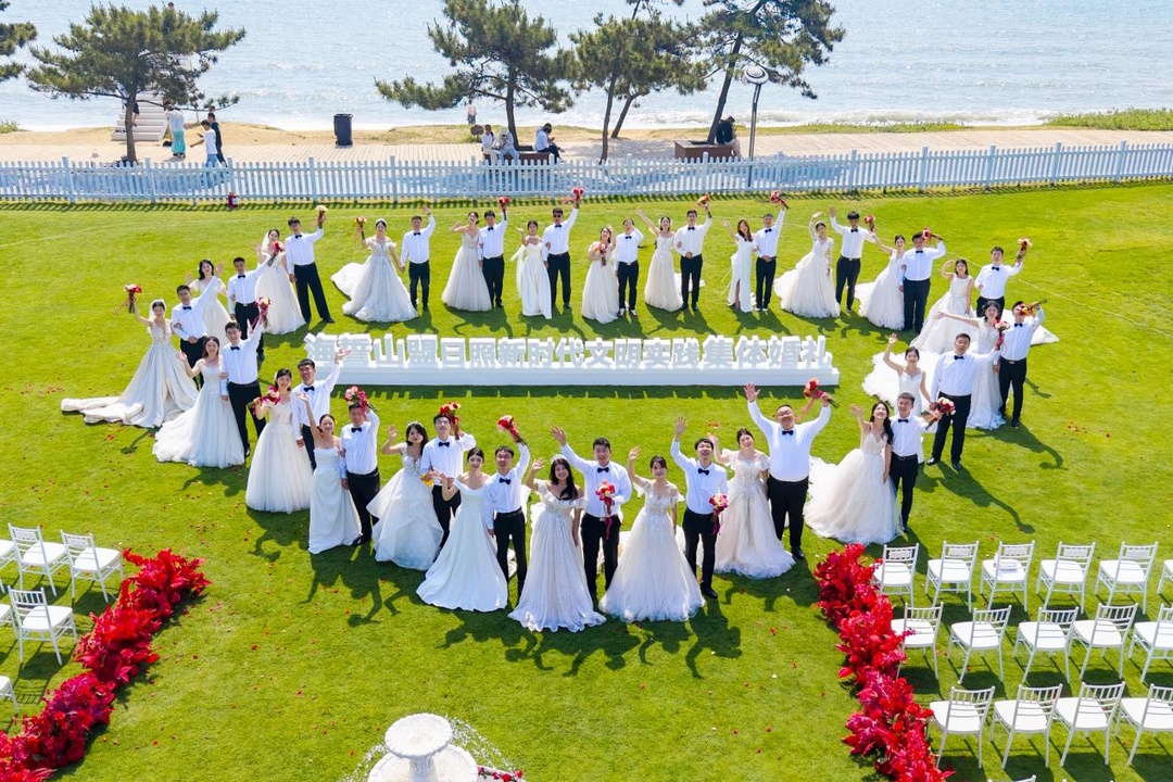 5月20日,日照市举办“福彩添‘福’ 喜上加‘喜’——‘海誓山盟’”日照新时代文明实践集体婚礼活动。23对新人以山海为媒,以文明为约,在壮阔山海的见证下喜结连理。