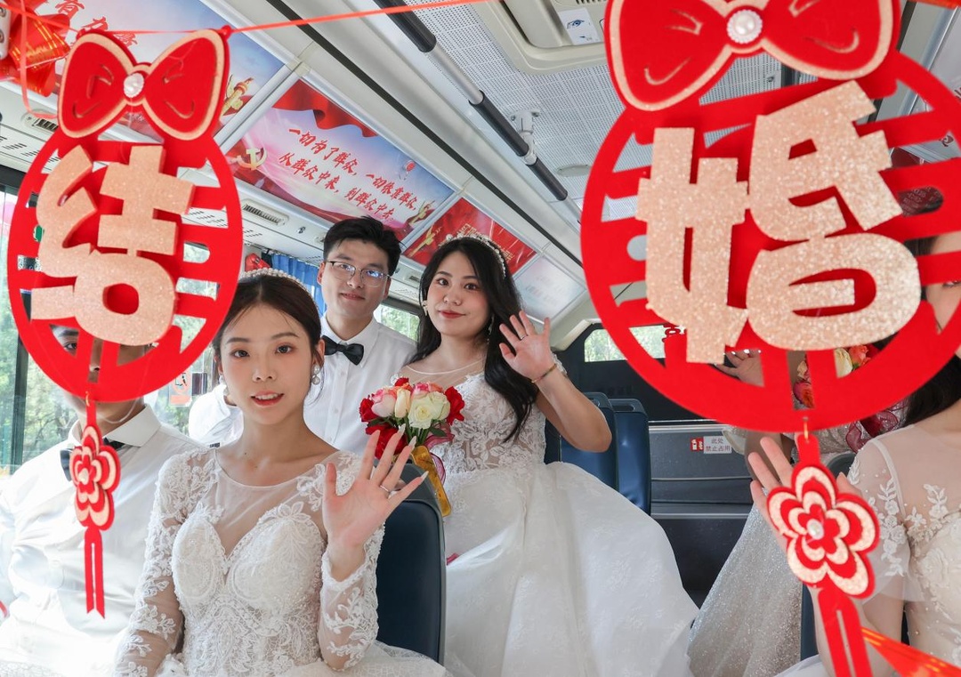5月20日,参加“海誓山盟”日照新时代文明实践集体婚礼的新人们坐公交出行,践行移风易俗新风尚。