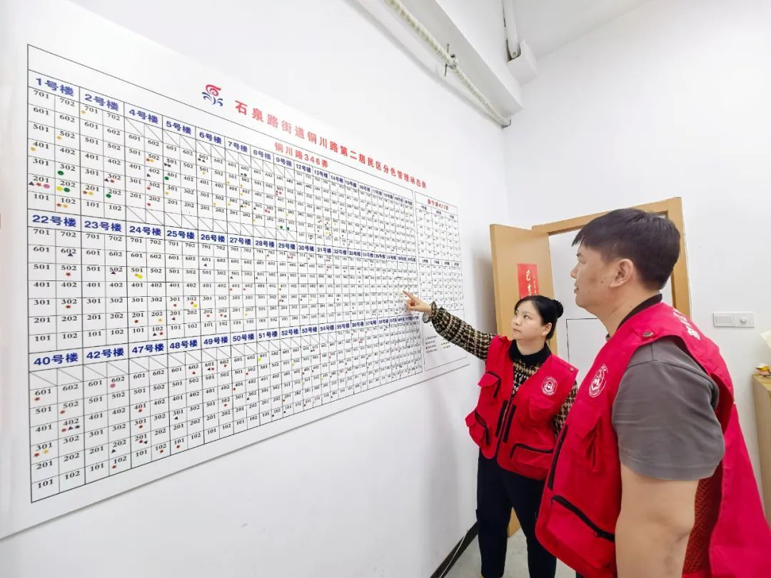 以红色五角星标注社区党员(骨干),紫色三角形标注楼栋长或居民代表,粉色圆形标注第二梯队力量或社区达人……居委会的墙面上“九色动态图”清晰标注着每栋居民楼的治理重点。铜二居民区社工在常态化走访时发现,标有黄色五角星的独居老人家中出现异常——窗户紧闭,前一晚送来的餐食没有取用,于是立刻调取九色电子档案中的紧急联系人和医疗记录,在通知老人子女后联系物业完成破门救援,将不慎在浴室滑倒的老人送医治疗。这种“颜色识别—数据联动—快速响应”的闭环,正是九色管理系统的核心运行逻辑。