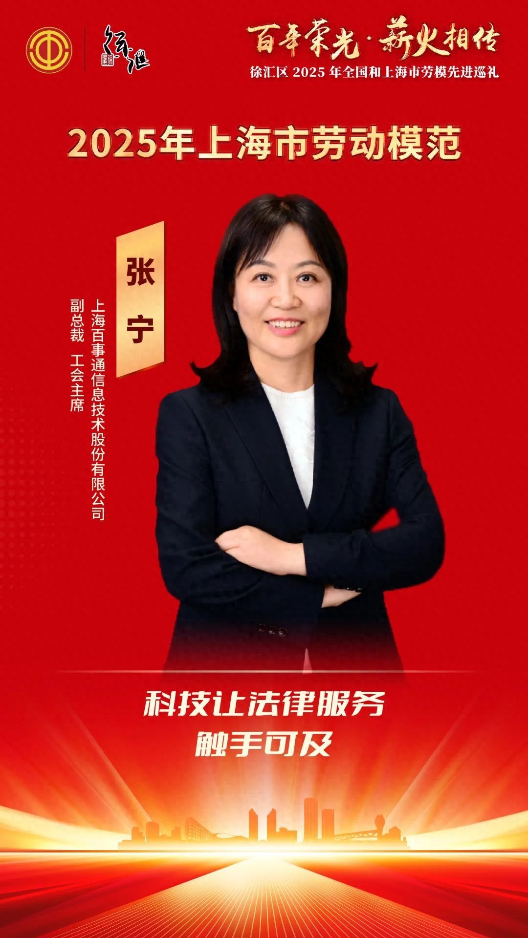 张宁,上海百事通信息技术股份有限公司副总裁、工会主席。她秉持“让法律成为中国人的生活习惯”的理念,深耕法律科技服务领域,矢志不渝地探索前行,不断突破自我,使命必达,为公司的稳定发展和社会法治水平的提升作出了卓越贡献。