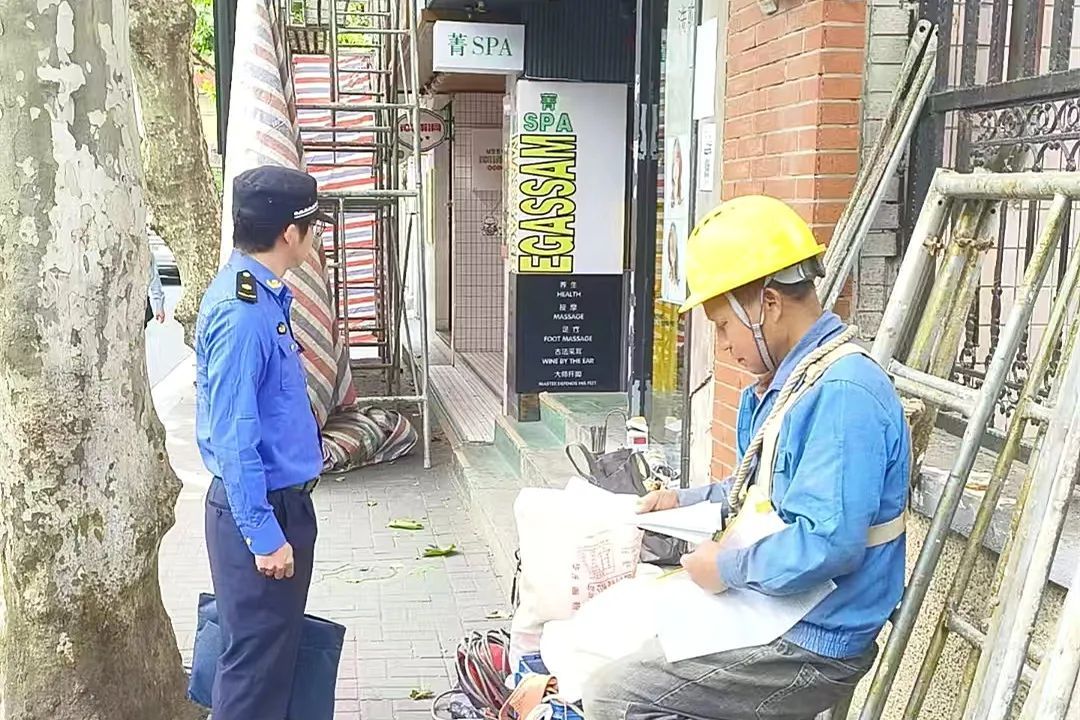 执法人员还在整治中发现,某处正在进行装修的沿街商户不仅未办理相关占道审批手续,还随意占用公共人行道搭建脚手架,堆放建筑材料、设置围挡,严重影响行人正常通行,并埋下不小的安全隐患。装修现场散落的建筑垃圾、未及时清理的装修废料,也使周边环境脏乱不堪。执法队员依据《上海市临时占用城市道路管理办法》,现场对占道装修商户和施工单位进行普法教育,要求立即停止违规占道行为,限期清理现场,恢复道路原状,办理好相关手续后方可继续进行施工。