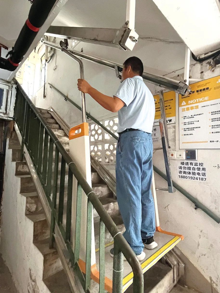 这些年,张晔始终忙着张罗老楼加梯事宜,但由于楼栋地下是防空洞,没条件挖井道、装电梯,他一直在寻找合适的加梯“平替”设备,先后看了几家电梯企业并亲身体验,最后这款简单上下的牵引式滑行梯让他眼前一亮。在征询了邻居们意见,取得全票通过后,张晔夫妇和4楼的一家住户先行垫付了前期安装费用,一周左右就安装完毕。