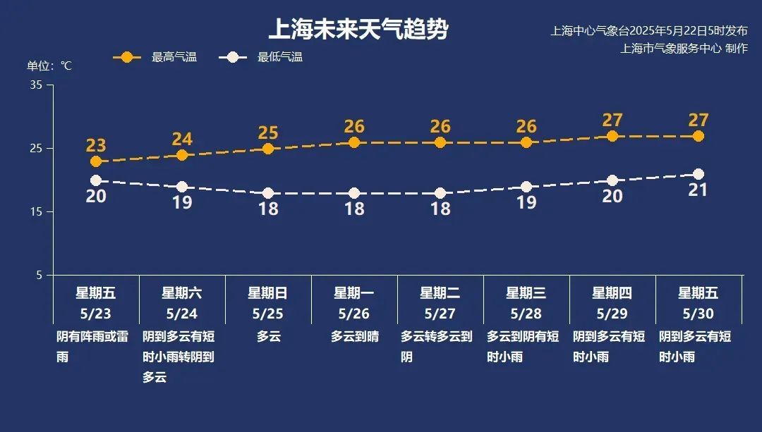 上海中心气象台预计,受气旋东移影响,申城明天将会有一次明显的降水过程,局部地区累积雨量可达大到暴雨,雨水影响下,全天气温回落至20~23℃,体感一下子清凉不少。周六起,雨水减弱,夜间雨止转阴到多云;周日至下周初,申城以多云天气为主;下周三起,雨水又要增多了。