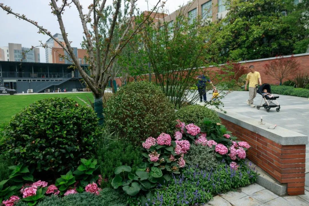 园内种植了大量绿植、花卉,除了红枫,还有月季、绣球花、黄金菊、蓝花鼠尾草等品种,为市民提供了一处自然生态的绿化共享空间。此外,结合园内道路走向,还设置条形木质座椅,增加了整体景观的层次感。