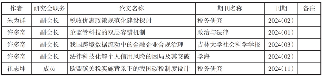 1.陈少英(会长)主编、欧阳天健(副秘书长)副主编:《税法学教程(第三版)》,北京大学出版社,2024年7月出版。2.许多奇(副会长)、程雪军译:《税法的哲学基础》,商务印书馆,2024年2月出版。3.许多奇(副会长)主编:《税法精要》,法律出版社,2024年8月出版。4.李九领(理事)主编翻译:《美国协调关税税则(前言及附录)》,上海财经大学出版社,2024年10月出版。5.李九领(理事)主编翻译:《美国协调关税税则(正文·上册)》,上海财经大学出版社,2024年10月出版。6.李九领(理事)主编翻译:《美国协调关税税则(正文·下册)》,上海财经大学出版社,2024年10月出版。7.欧阳天健(副秘书长)著:《个人所得税反避税问题研究》,法律出版社,2024年2月出版。8.全开明(成员)著:《税务筹划实务指引:优惠与风险,法律出版社,2024年5月出版。