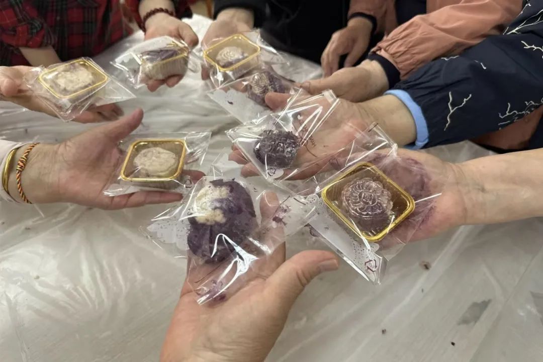现场,居民们分工协作,撒椰子粉、压模具、装盒包装……动作逐渐熟练。不消片刻,一盒盒色泽明艳、花纹精致的山药紫薯糕便制作完成。居民们热情介绍各自的健康妙招与养生心得:薄荷叶泡水解暑、茯苓茶安神助眠……欢声笑语间,邻里情谊悄然升温。