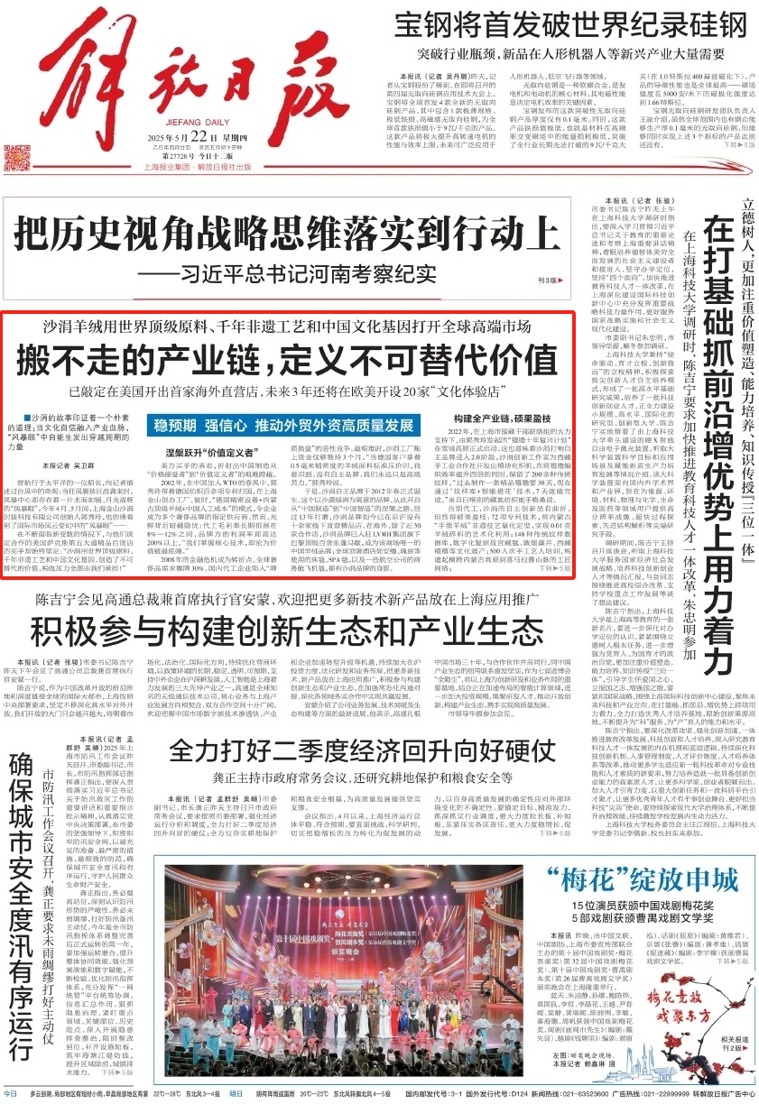 5月22日,《解放日报》头版刊发《搬不走的产业链,定义不可替代价值》。