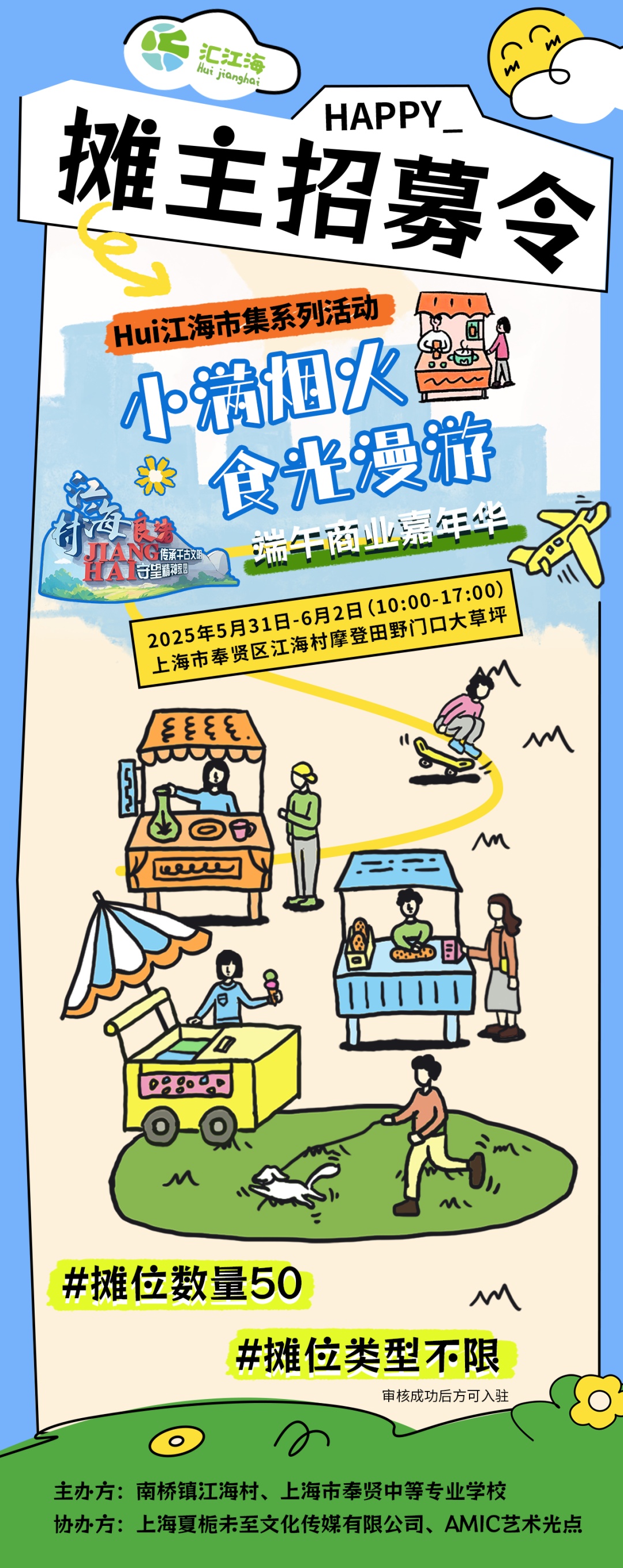 端午假期 假期松弛感get! 蝉鸣摇醒荷叶,夏风裹着稻浪 这个端午假期 Hui江海市集即将开启! 我们以“热土之名”广发邀约 诚邀“手艺人”共创烟火市集 邀您带着祖传手艺、农家风味、创意巧思 共同打造“家门口”的网红市集! 活动详情 摊位规划 摊位地址: 江海村摩登田野门口大草坪 (超越阳光草地网球中心三号门) 摊位数量: 约50个 摊位面积: 约2平方米 摊位数量有限,先报先得,为了使市集摊位更多元化,同类型摊位不重复摆摊。 申请流程 线下申请 申请地址: 南桥镇五星中心路379号 (江海村村民委员会) 联系人: 顾老师13671750734 袁老师13916932362 材料提交: 需提供身份证复印件、经营商品清单及相关资质证明。 签署承诺书: 签订《江海村集市摊位诚信经营承诺书》 申请时间: 即日起至5月30日 (每日8:30~16:30) 管理要求 经营时间: 5月31日至6月2日10:00~17:00 摊位规范: 禁止使用明火及大功率电器。不得擅自扩大摊位面积或变更经营内容。需自备垃圾容器,保持环境卫生。 免责声明: 本次集市仅提供摊位场地、摊位,摊主人身安全及货品安全自负。