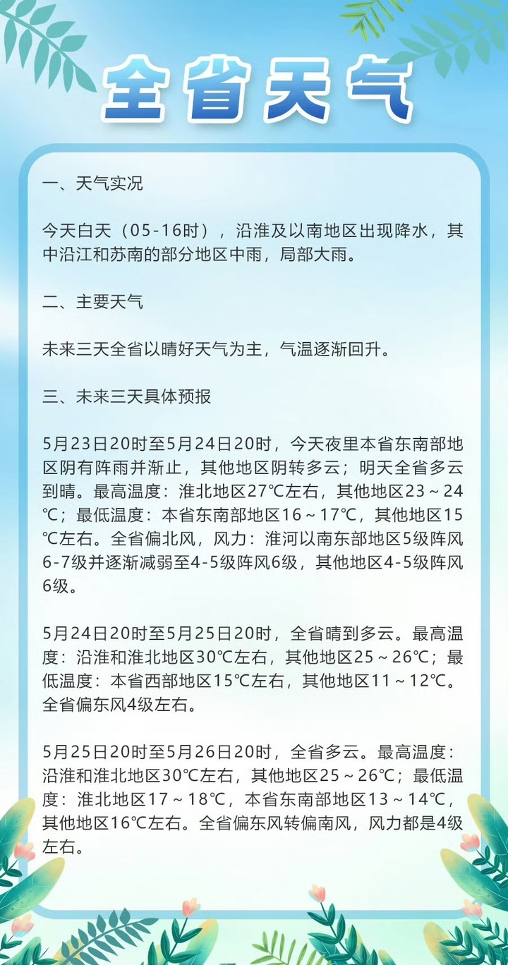 5月24日20时至5月25日20时,全省晴到多云。最高温度:沿淮和淮北地区30℃左右,其他地区25~26℃;最低温度:本省西部地区15℃左右,其他地区11~12℃。全省偏东风4级左右。