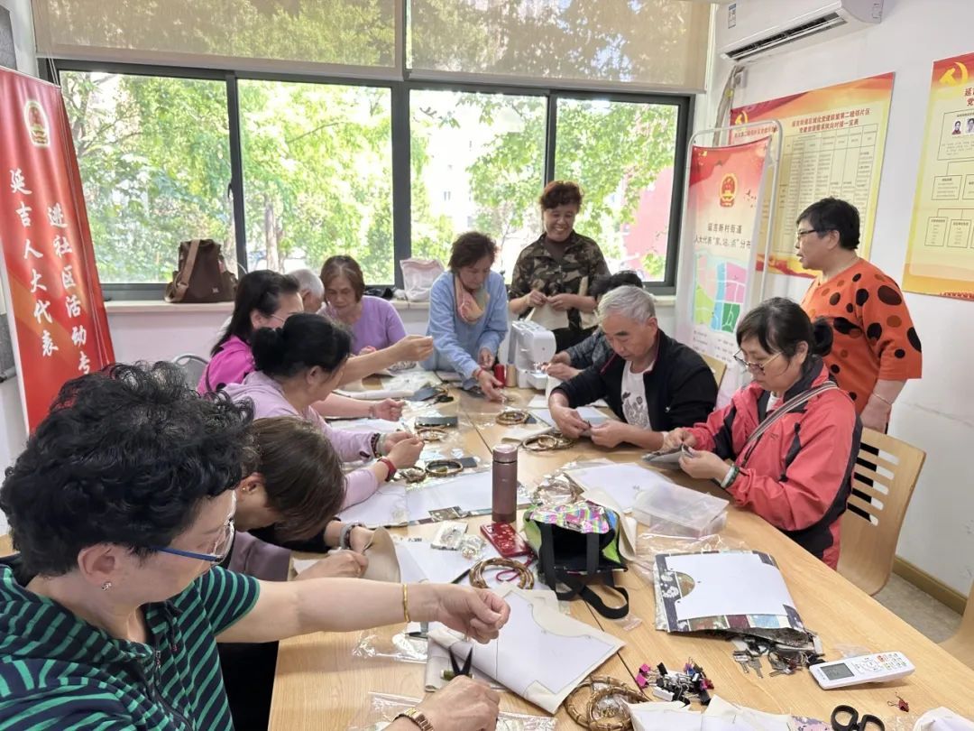 活动上,一群特殊的“主角”——来自“蝶邻坊”围裙服务队和“夕阳模抖”志愿服务队的志愿者们,围坐在一起,兴致勃勃地学习制作中式竹节手腕包。平日里,她们是社区里无私奉献的“热心肠”,用温暖与关怀照料着社区的年轻社工和志愿者们。现在,她们在轻松愉悦的氛围中,一同体验传统手作的乐趣。