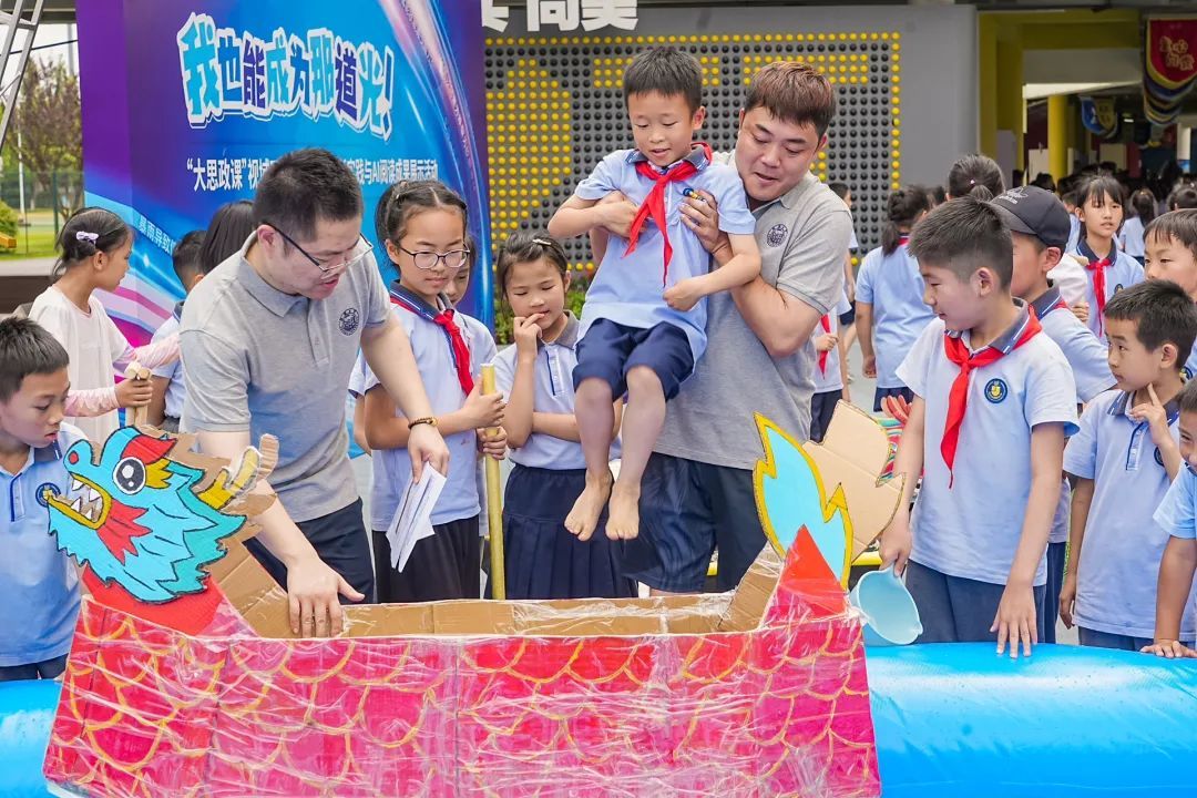 从创意萌发到劳动创造,各年级的学生还迎来了不同主题的挑战:如何设计一种仿生风筝,让风筝飞得更稳、更高?长椅能像鸟巢一样遮雨、储物吗?暴雨导致信号灯失灵,AI如何指挥交通?如何让龙舟在急流中不翻船?如何设计“傻瓜式”快递分拣站,让包裹自动分类到不同区域?本次展示活动,学生“秀”出了自己的创新创造成果,于是便有了文章开头的那一幕。