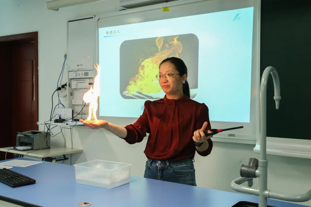 物理教室发出一阵阵惊呼,只见物理教师田艳在湿润手掌上点燃丁烷与洗洁精混合泡沫,“火焰”自她的手上升起,持续燃烧的火焰却丝毫不烫伤皮肤。“这是为什么?”学生们纷纷追问,田燕笑着切入今日课程的主题——汽化,“当火焰在燃烧的时候,周围的水被蒸发,吸收了大量的热量,皮肤表面温度实际上是比较低的,所以是安全的。”