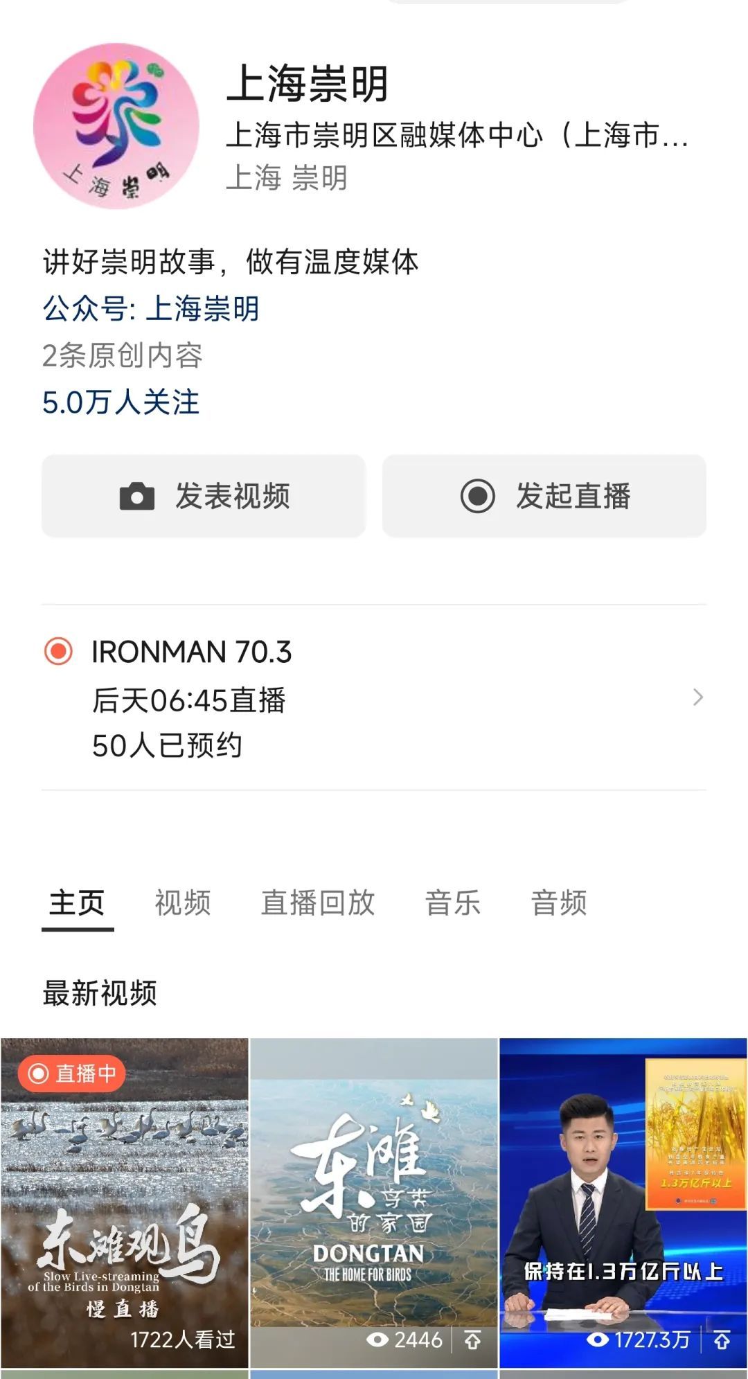 2025光明田原IRONMAN 70.3上海崇明站 将正式开赛 今天给大家出一期直播观赛指南 当天开赛时间较早 请大家务必调好闹钟哦 与此同时 “上海崇明”小红书也发布了互动帖 欢迎各位参赛选手和铁三爱好者积极互动 贴纸、徽章及神秘礼物等你赢! 直播时间 5月25日7:00-13:00 直播平台 “上海崇明”抖音号 关注下方“上海崇明”抖音号, 进入直播间即可观看。 “上海崇明”视频号 扫一扫下方二维码, 关注“上海崇明”视频号, 观看现场直播。 “上海崇明”视频号直播预约界面 互动赢礼平台 “上海崇明”小红书 记者:顾欢欢 编辑:焦倩倩