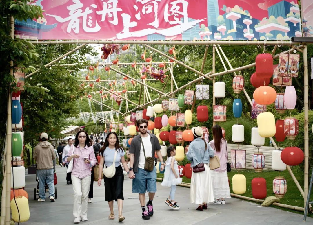 现场不仅有龙舟竞渡的速度与激情,还有以 “龙舟上河图” 为主题,在天安千树商场和苏州河梦清园环保主题公园推出的两大特色市集——一边是复刻千年宋韵的“水岸繁华”,一边是穿越时空的“沉浸剧本游”和“龙狮巡游盛宴”,这就带你去看看这两场盛会如何赋能体育赛事。