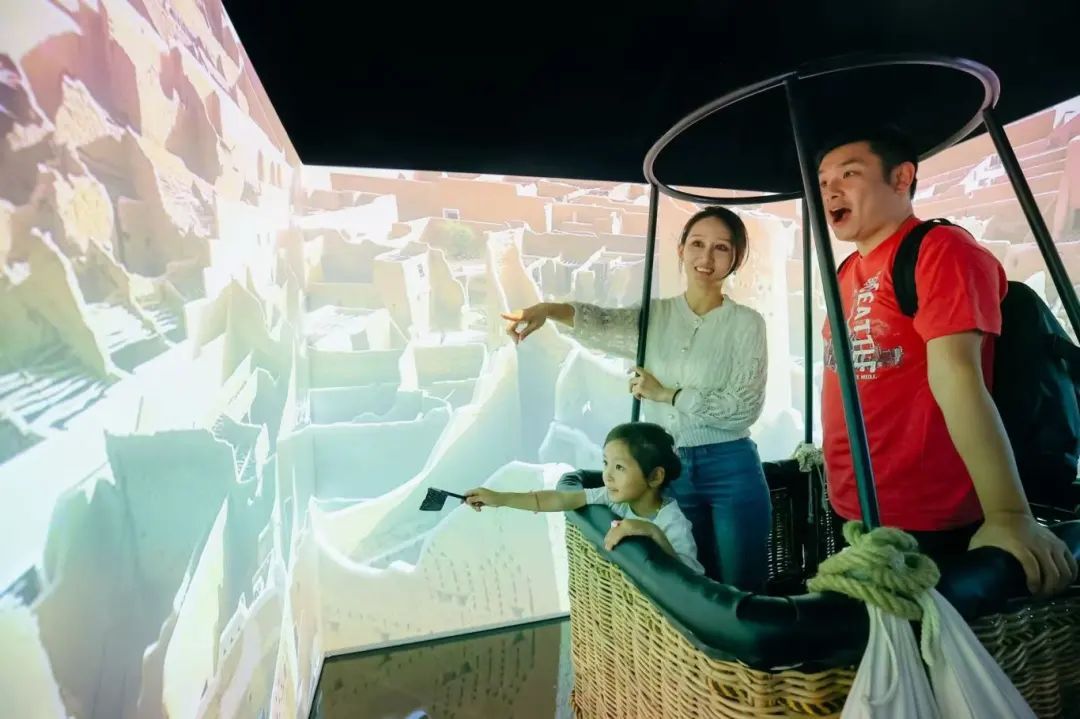 活动现场分为六大主题区,每个区域都暗藏互动玄机。热气球拍照体验区让游客得以“驾驭季风”。带着孩子体验的李先生告诉记者:“模拟热气球升空时,脚下LED屏同步显示古城全景,仿佛真的在空中飘荡。”据工作人员介绍,该装置精确还原了地貌。