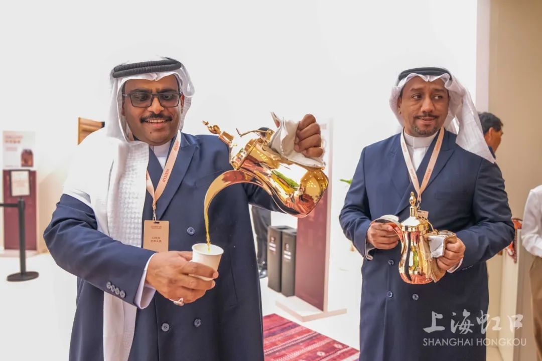 咖啡体验区则完美呈现沙特“达瓦”待客礼仪。铜壶在炭火上冒着热气,咖啡师向围观市民游客展示着冲泡过程。正在体验手冲的周先生表示:“很有中东气息,好像穿越了,希望能多举办类似活动。”