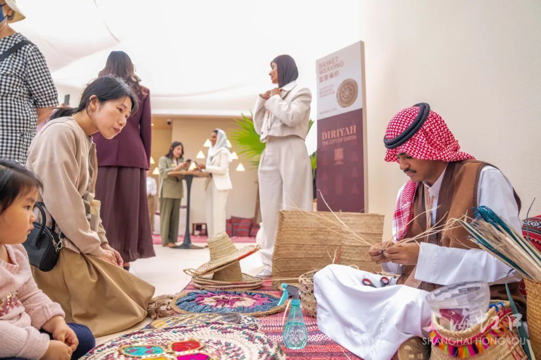 编织工坊成为亲子家庭聚集地,沙特编织师现场一针一线编织着图案,家长孩子们围坐,用手指触摸棕榈纤维编结传统图案。“这比乐高更有挑战性,我很感兴趣。”一位小朋友告诉记者。
