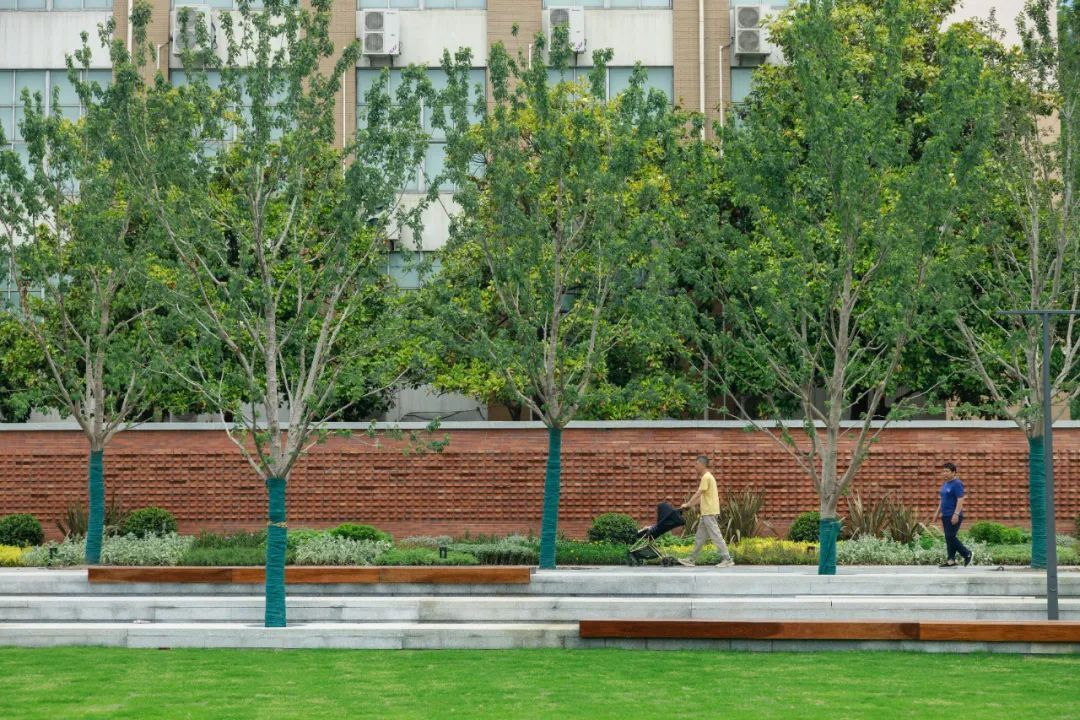 核心区综合景观提升项目是此次更新的一大亮点,其中包括了备受关注的复旦大学政肃路体育场地围墙的通透式改造。昔日厚重的围墙被更具设计感的栏杆或绿篱取代,打破了校园与社区的物理隔阂,实现了视觉上的延伸与空间的共享。