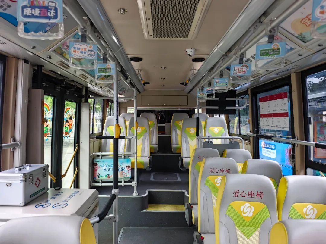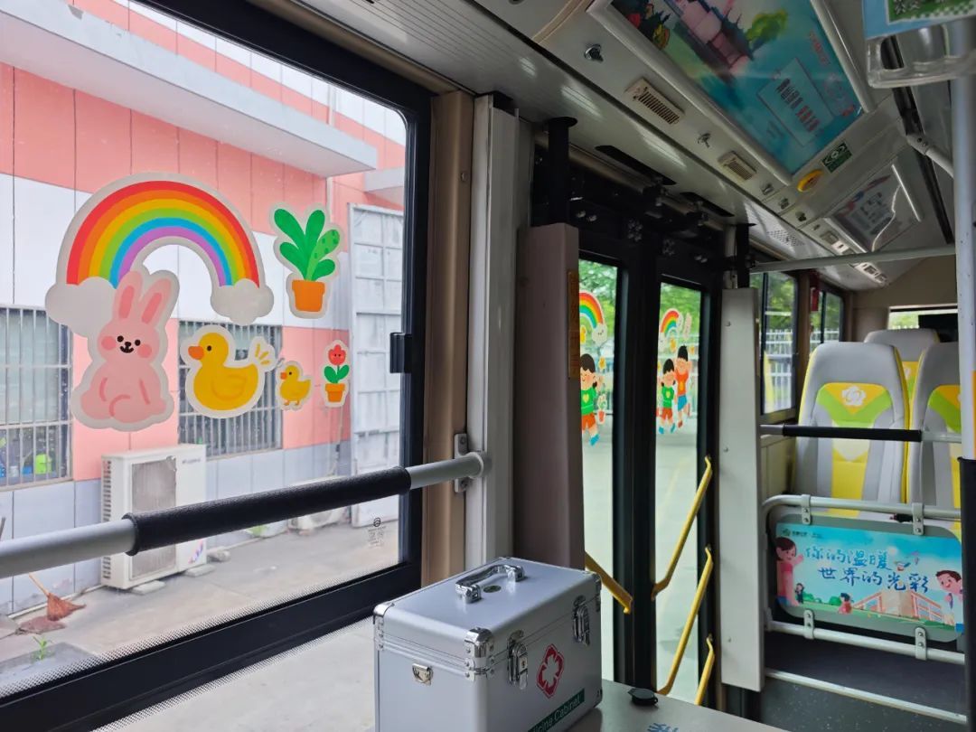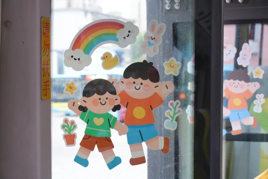 步入定制专线,禧宝一眼就被车厢中温暖明亮的装饰吸引了。工作人员不仅在车窗上贴了不少卡通可爱窗花,还在车灯箱上贴了站点图,每个站点的颜色与站点手举牌相同,更方便学生们一一对应。车窗上还贴了简单的手语教学,供安全员参考。