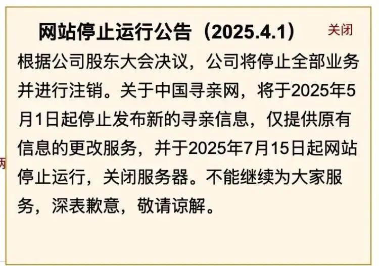 近日,中国寻亲网在官方网站发布公告,将于2025年7月15日正式关闭服务器。