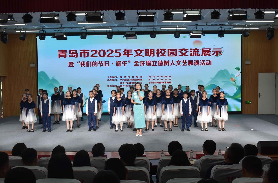艾叶飘香迎端午,文明校园展新篇。为弘扬中华优秀传统文化,深化全环境立德树人和文明校园创建工作,5月29日,青岛市2025年文明校园交流展示暨“我们的节日·端午”全环境立德树人文艺展演活动在胶州市香港路小学举行。