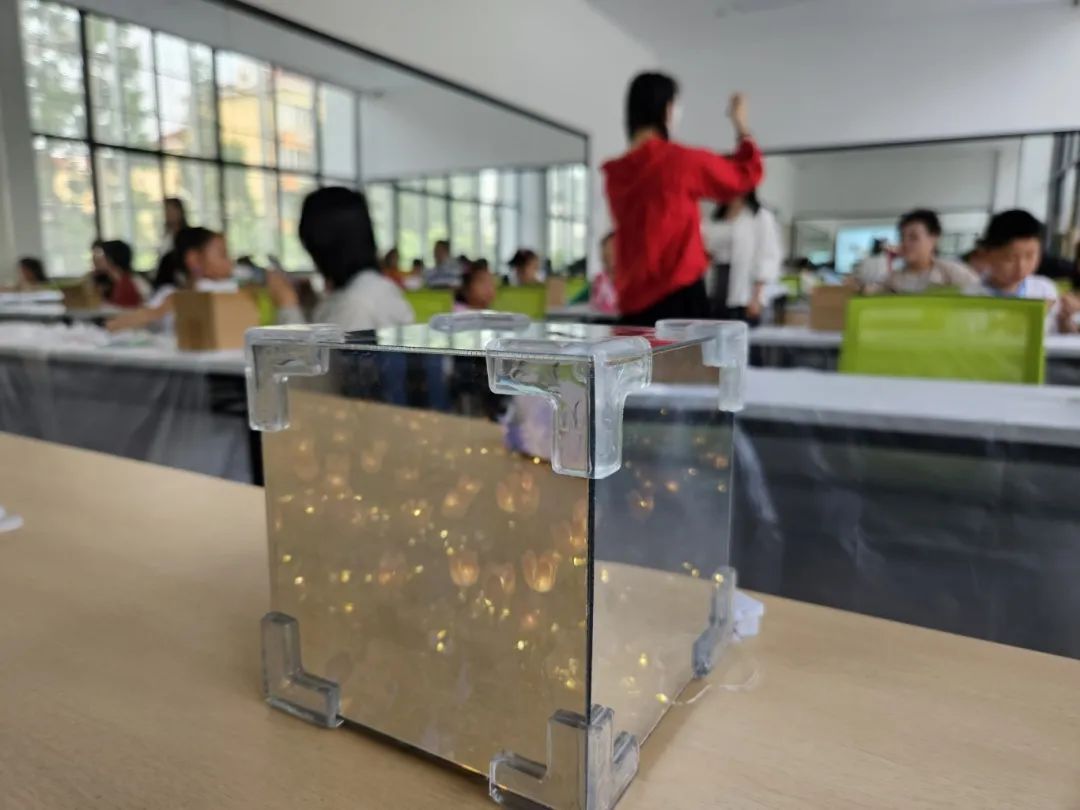 作品完成,孩子们自发地围聚在一起,眼中闪烁着对彼此作品的惊喜与欣赏,一句“你的红瓣配上我的紫瓣,拼在一起肯定美得像彩虹!”瞬间点燃了分享的火花。夜灯亮起的刹那,暖光穿透花瓣,将整个教室化作梦幻星河。孩子们捧着亲手制作的夜灯,笑容比灯光更灿烂,这份成就与喜悦,因分享而倍增。