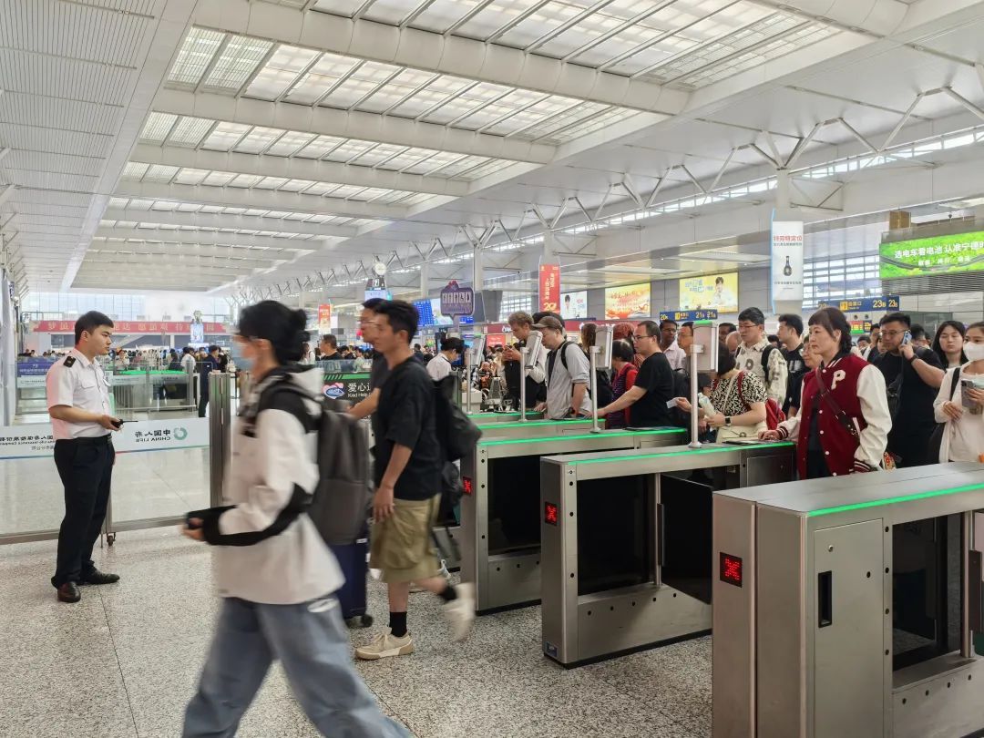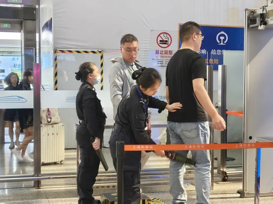 为方便旅客顺利出行,铁路上海站根据客流变化,灵活设置旅客进出站流线,高峰期开足安检仪、采用“双手检”,尽可能缩短旅客进站时间。