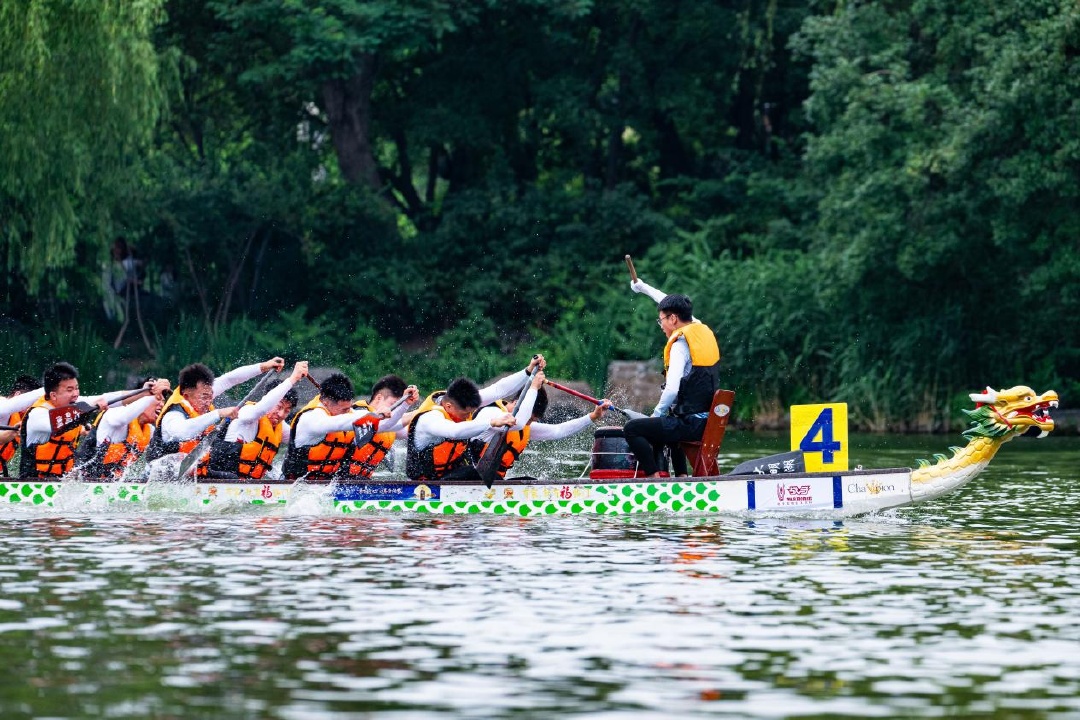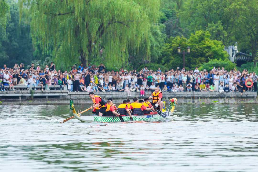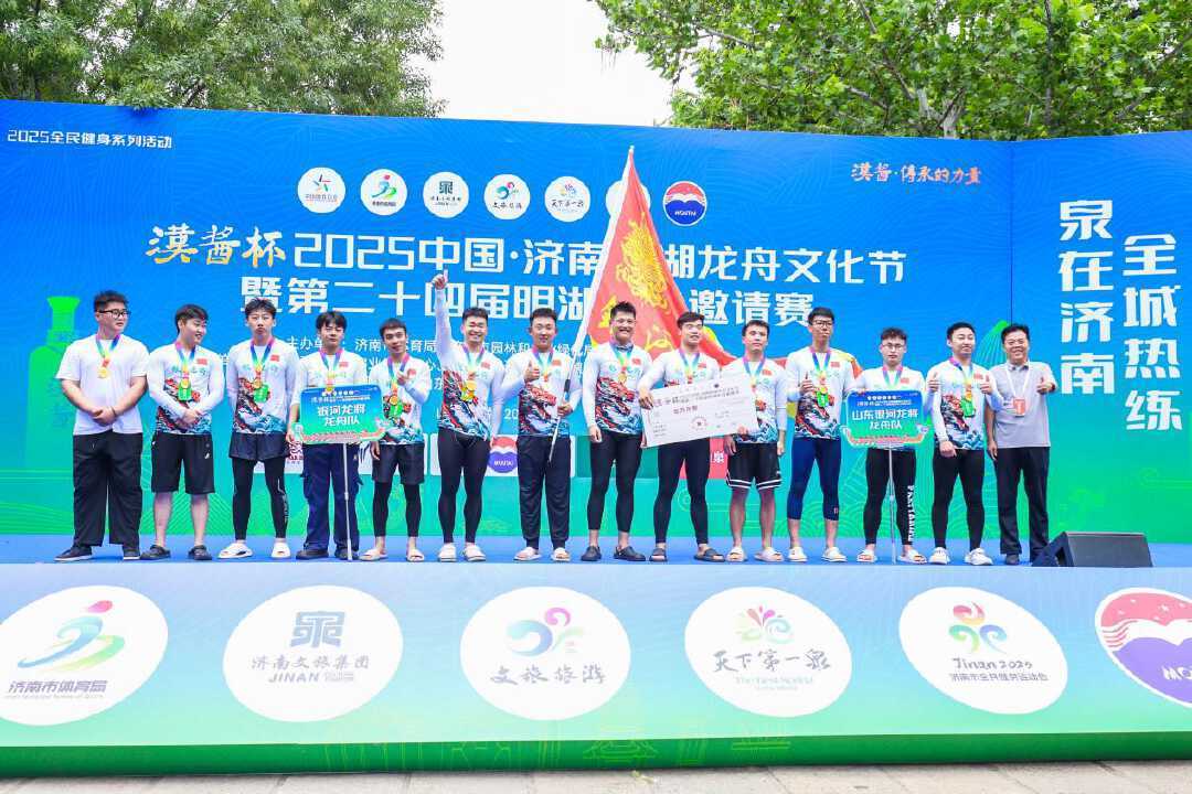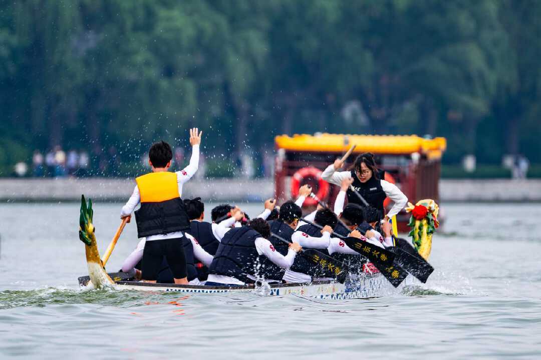 济南大明湖是全国独一无二的泉水湖,在泉水之上进行龙舟竞渡,别有一番意境。鼓声铿锵,百桨逐浪。随着发令枪响,比赛正式拉开帷幕。一条条龙舟如蛟龙出水,在辽阔湖面掀起竞逐浪潮。鼓槌与木桨击出铿锵节奏,口号声浪伴随着水花激荡,鸣奏力与美的水上交响。选手们弓腰挥臂、整齐划桨,船头劈开粼粼波光,桨影翻飞间尽显团队默契。岸边数万名观众热情高涨,呐喊声、助威声、欢呼声此起彼伏,将现场气氛推向高潮。最终,银河龙将龙舟队夺得200米决赛、500米决赛双冠。