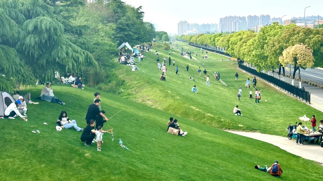 早前,随着露营这一休闲模式持续升温,大绿坡延绵2公里的草甸与大片樱花林迅速成为网红打卡地,周末帐篷数量可达上百座。但随之而来的则是由于人流激增产生的停车难、卫生管理难、宠物管理难、绿化养护难等诸多方面的挑战。针对这些问题,街道成立专项工作组,由城建中心牵头联动城管、交警,将大绿坡纳入市政养护重点区域,打出一套综合养护“组合拳”。