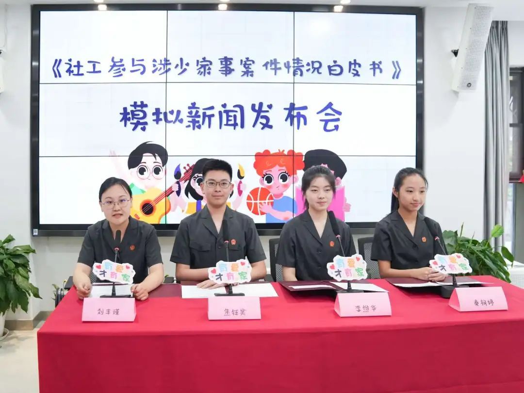活动中,《社工参与涉少家事案件情况白皮书》正式发布。区法院法官助理与上海戏剧学院附属高级中学的高中生们为大家召开了一场模拟新闻发布会。
