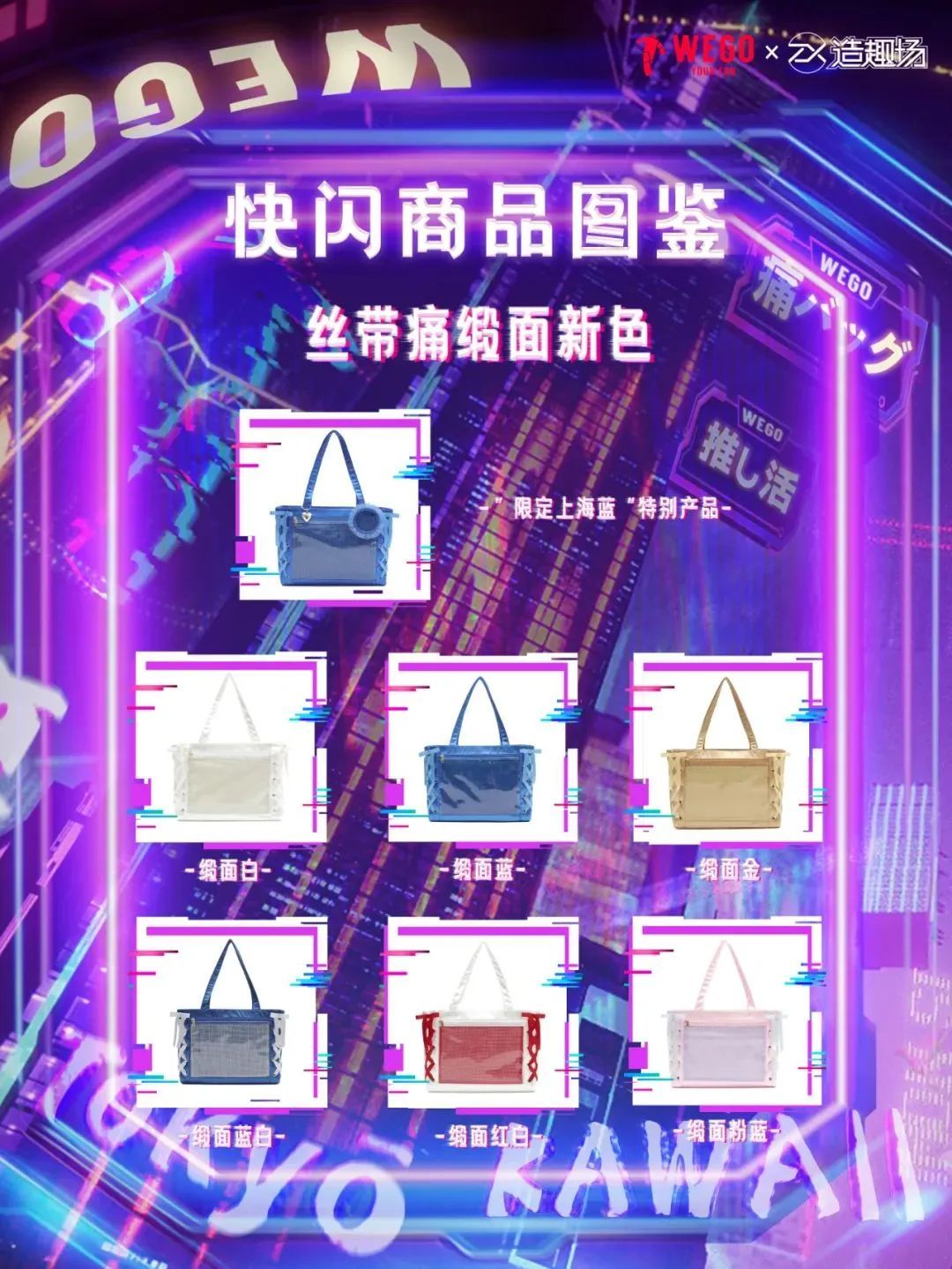 在次元界,WEGO是痛包潮流设计的风向标。粉丝们通常会将痛包(itabag)挂满人物徽章和玩偶等周边,外侧通常配有透明夹层以展示“谷子”。